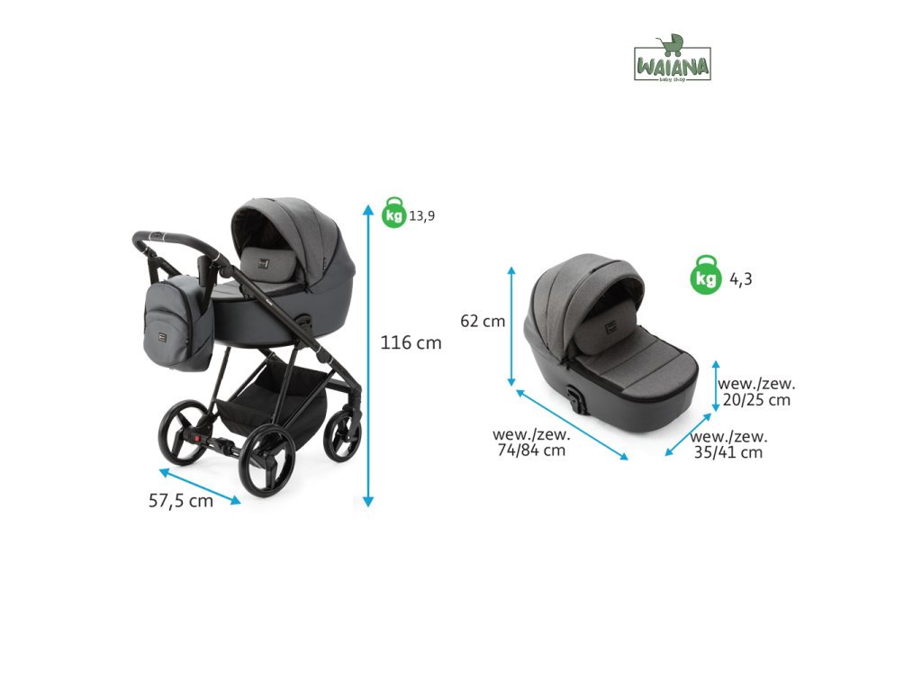 - Rozmery zloženého kočíka: 116 x 57,5 x 110-119 cm (D x Š x V)