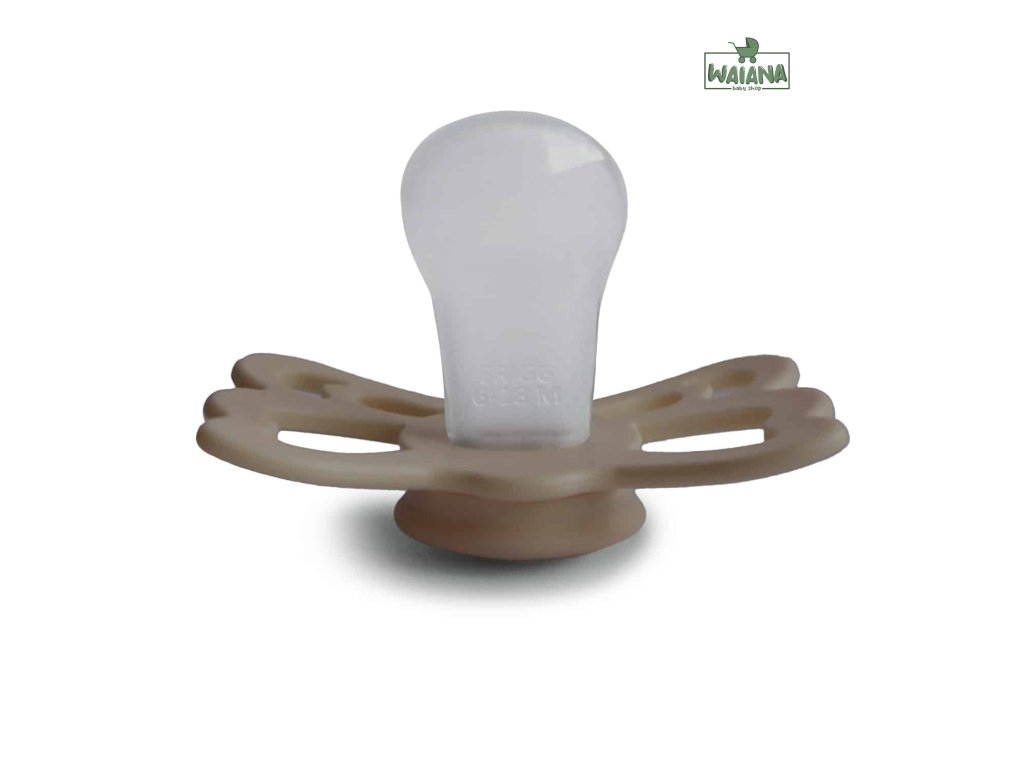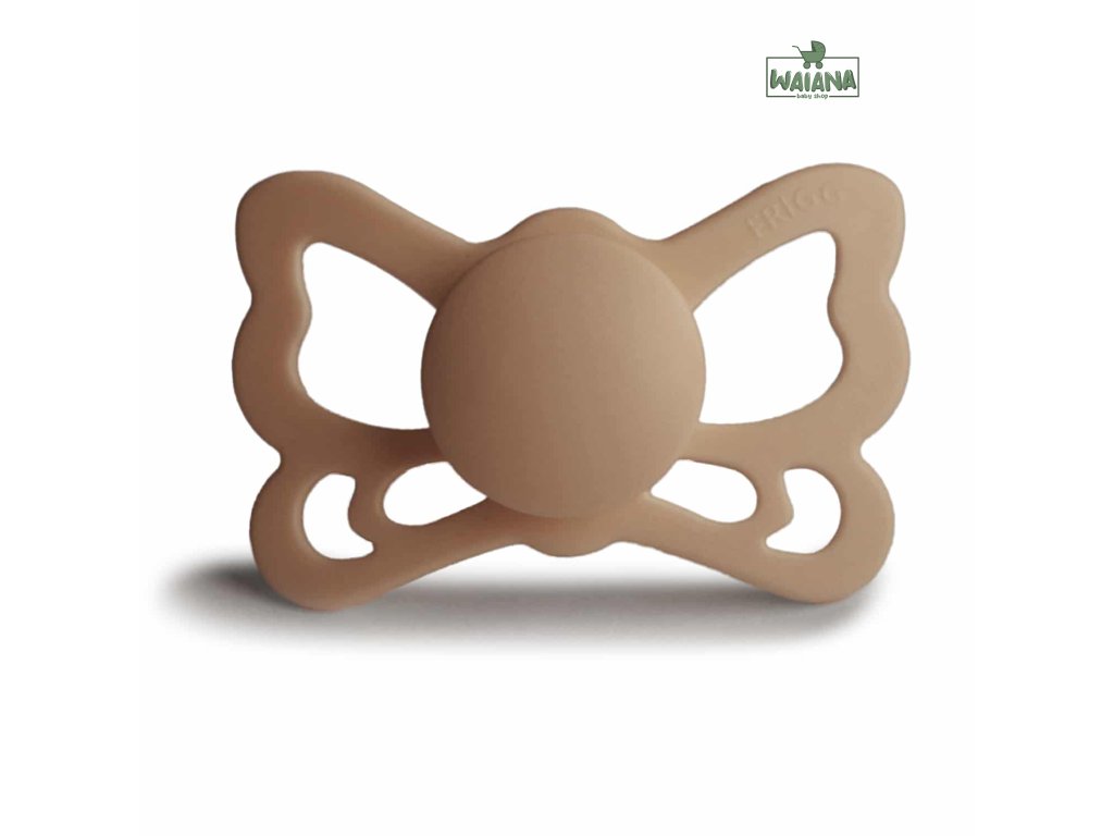Tvar cumlíka FRIGG Butterfly pripomína motýľa. Štít so zvlnenými okrajmi má veľké vzduchové otvory pre väčšiu bezpečnosť a jeho okrúhly stred krásne zvýrazňuje eleganciu cumlíka.