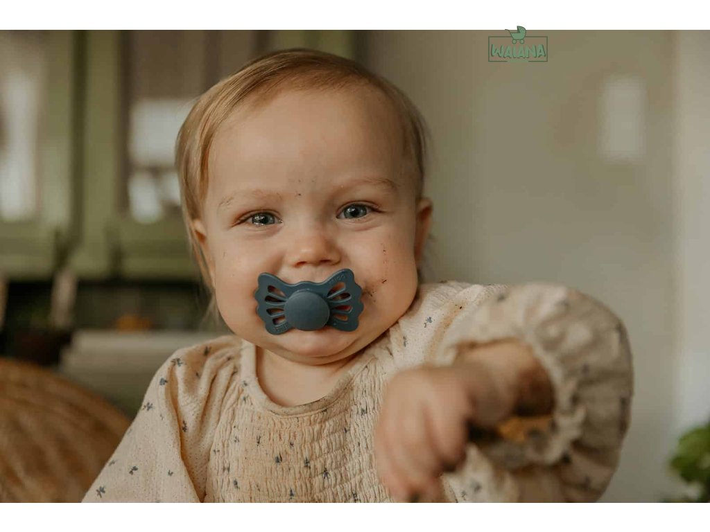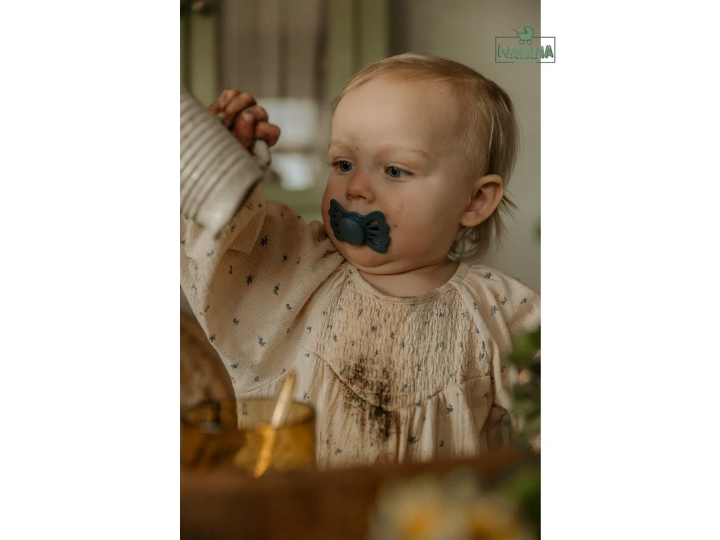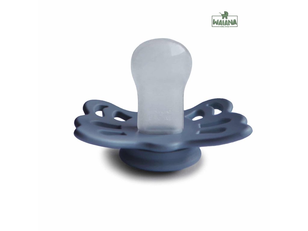 Tvar cumlíka FRIGG Butterfly pripomína motýľa. Štít so zvlnenými okrajmi má veľké vzduchové otvory pre väčšiu bezpečnosť a jeho okrúhly stred krásne zvýrazňuje eleganciu cumlíka.