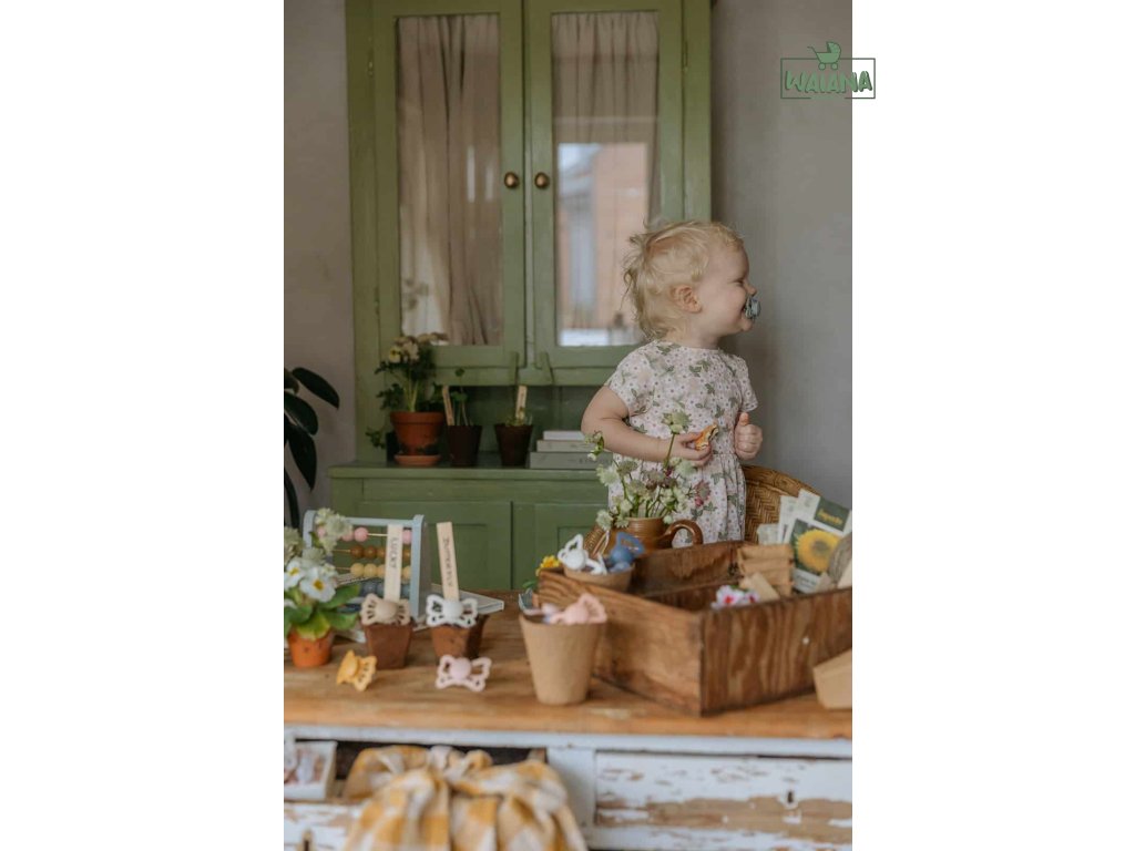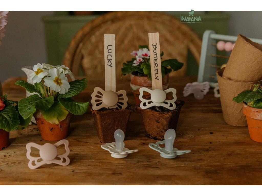 Tvar cumlíka FRIGG Butterfly pripomína motýľa. Štít so zvlnenými okrajmi má veľké vzduchové otvory pre väčšiu bezpečnosť a jeho okrúhly stred krásne zvýrazňuje eleganciu cumlíka.