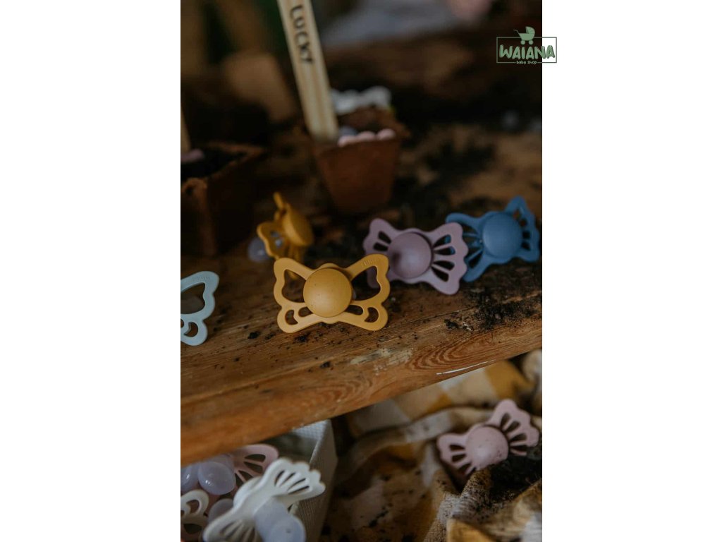 Tvar cumlíka FRIGG Butterfly pripomína motýľa. Štít so zvlnenými okrajmi má veľké vzduchové otvory pre väčšiu bezpečnosť a jeho okrúhly stred krásne zvýrazňuje eleganciu cumlíka.