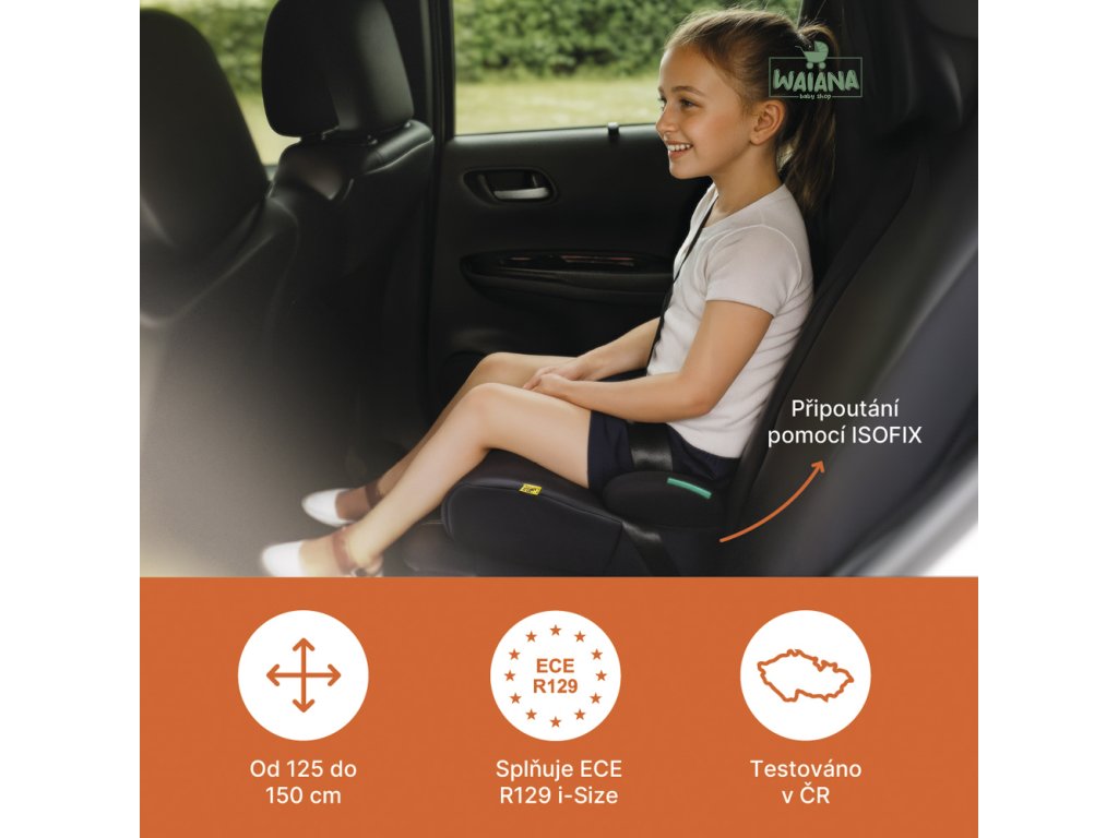 Podsedák spĺňa najnovšiu bezpečnostnú normu ECE R129 (i-Size) a má zásadnú funkciu: zabezpečuje správne vedenie 3-bodového bezpečnostného pásu cez boky a rameno, nie cez krk a mäkké brucho.