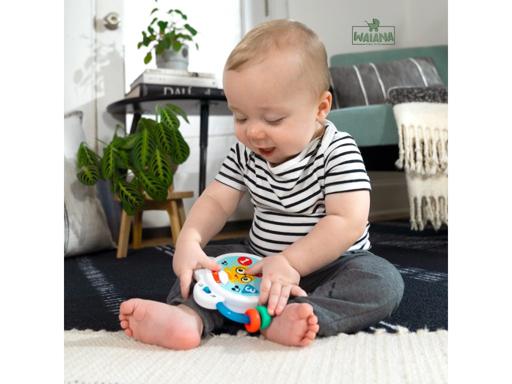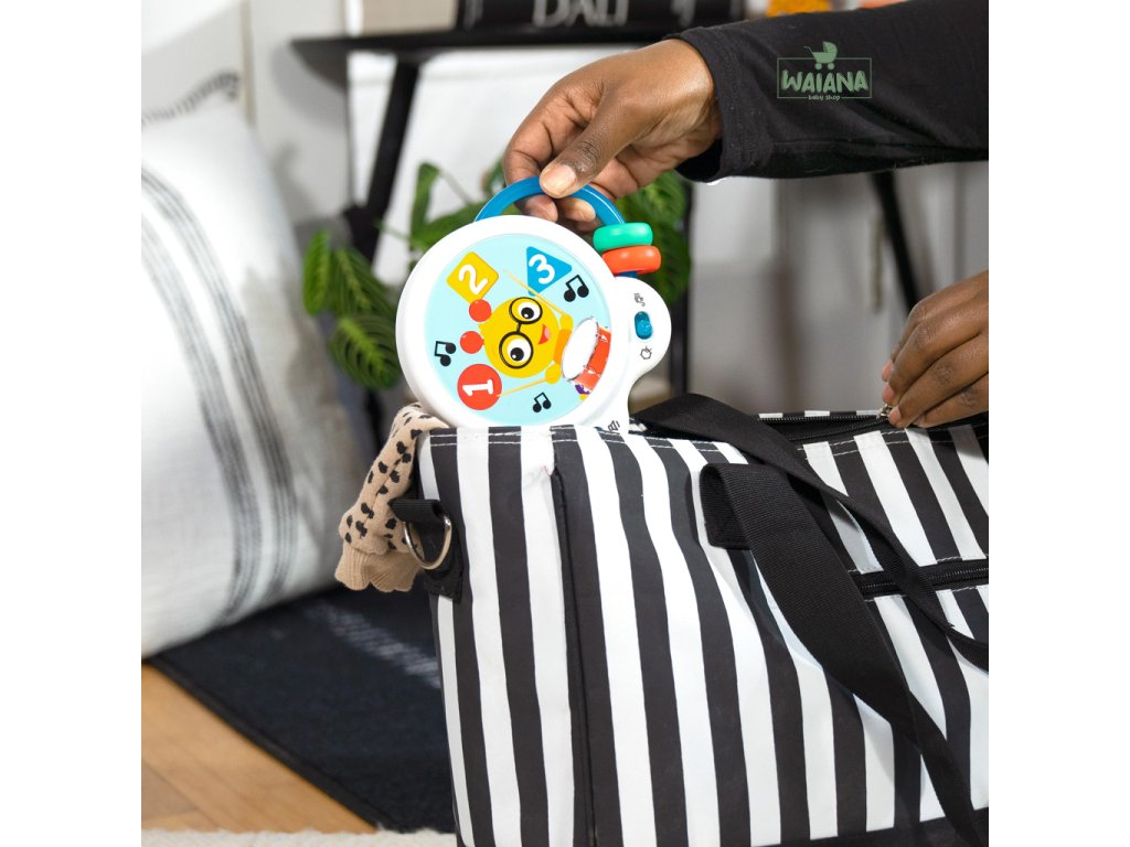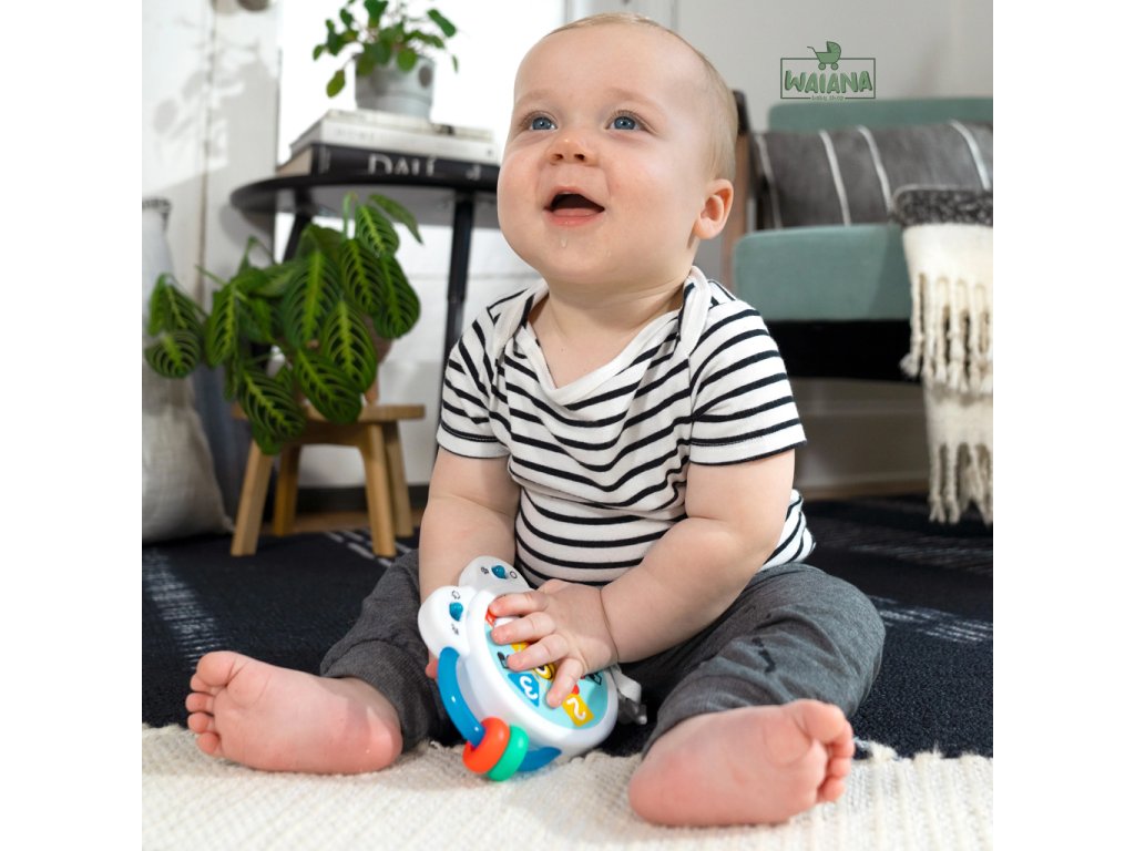 Pomôžte bábätku objavovať hudbu s hudobnou hračkou – bubnom Tiny Tempo. Tento ľahký a prenosný bubon obsahuje 21 reálnych zvukov nástrojov, 6 klasických melódií a dvojitý prstenec s korálkami, ktorý podporuje hudobné objavovanie, učenie sa princípu príčina–následok a rozvoj jemnej motoriky. Vďaka dvom herným režimom môže bábätko v režime Drum Play vytvárať jedinečné rytmy jednoduchým ťuknutím, alebo si v režime Melody zahrať spolu so 6 klasickými skladbami. Každé ťuknutie podporuje učenie príčina–následok. Hračka s korálkami pomáha rozvíjať obratnosť a jemnú motoriku. Farebné nálepky zoznamujú s farbami, číslami a tvarmi a obľúbený hudobný kamarát Cal the Caterpillar z kníh a videí Baby Einstein povzbudzuje bábätko pri hudobnom objavovaní. Bubon je ideálny na hudbu na cestách – je malý, ľahký, ľahko sa drží aj trasie a podporuje hudobné zapojenie v kočíku, na cestách aj pri hre doma. Vyžaduje 2 AA batérie. Čistí sa jednoducho utretím.