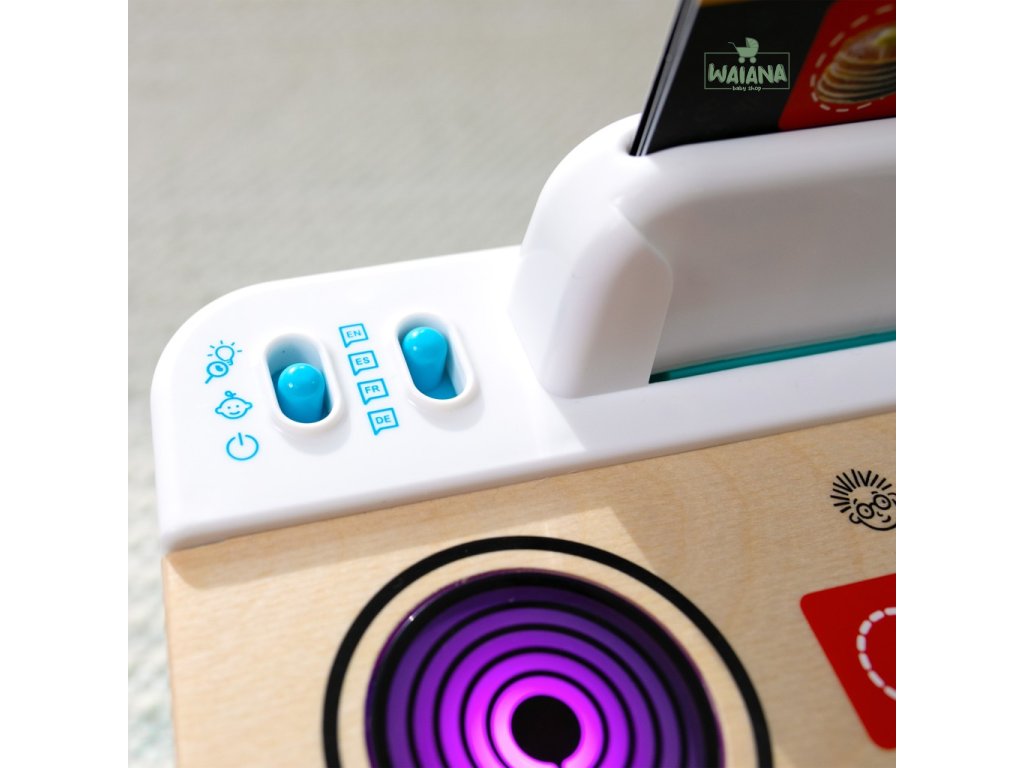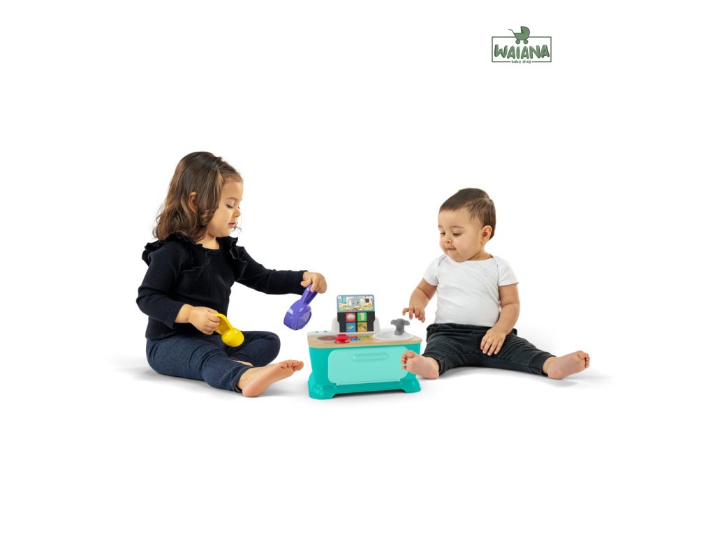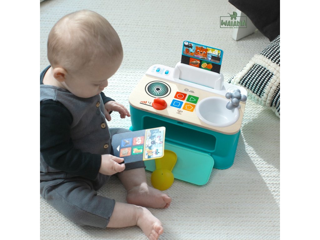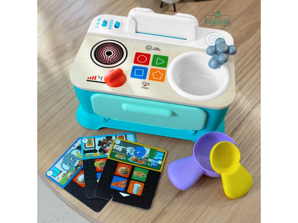 Pomôžte dieťaťu spoznať súčasti okolitého sveta, ako sú jedlá, farby a tvary, s kuchynkou Baby Einstein + Hape Magic Touch. Táto farebná kuchynka na hranie z dreva s certifikátom FSC je vybavená rúrou, drezom a varnou doskou, ktoré pomáhajú bábätku napodobňovať varenie! V režime Play môžu deti skúmať zvuky a melódie varenia. V režime Discovery - Objavuj sa môžu batoľatá učiť jedlá, farby a tvary v angličtine, španielčine, francúzštine a nemčine. 3 kartičky receptov pomáhajú bábätku „uvariť“ až 6 receptov na raňajky, obedy alebo večere pomocou priloženého hrnca a lyžice. Stlačte vybraný dotykový symbol na ultra citlivej varnej doske Magic Touch, aby ste uvarili každý recept za zvukov hudby a varenia. Bábätko bude zvedavé, keď bude otáčať gombíkmi sporáka a kohútika, čím aktivuje svetlá a zvuky. Táto malá prenosná kuchynka, ktorá je ideálna na hranie na zemi, pomáha podporovať rozvoj jemnej motoriky dieťaťa a inšpiruje k spoločnej hre s rodinou a priateľmi. Pre deti od 9 mesiacov do 4 rokov. Obsahuje 3 AA batérie.