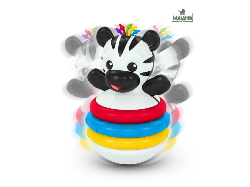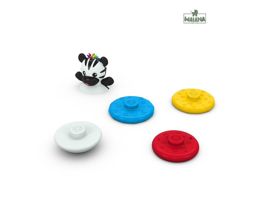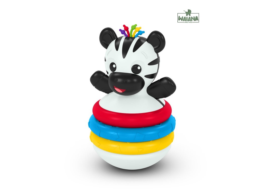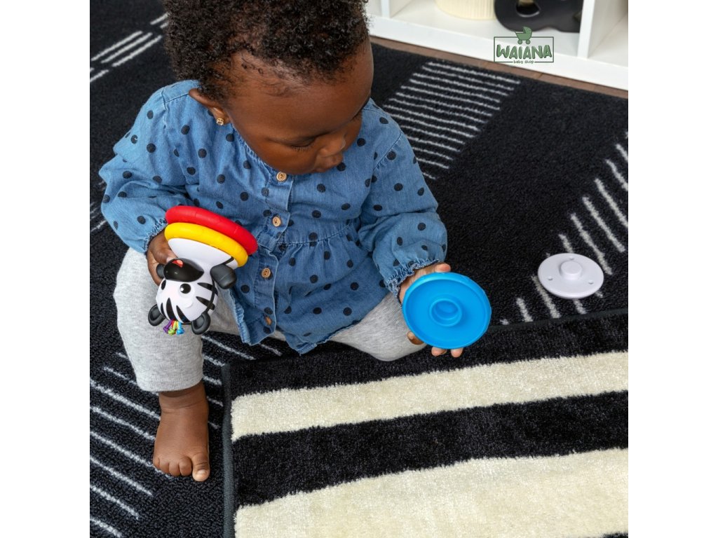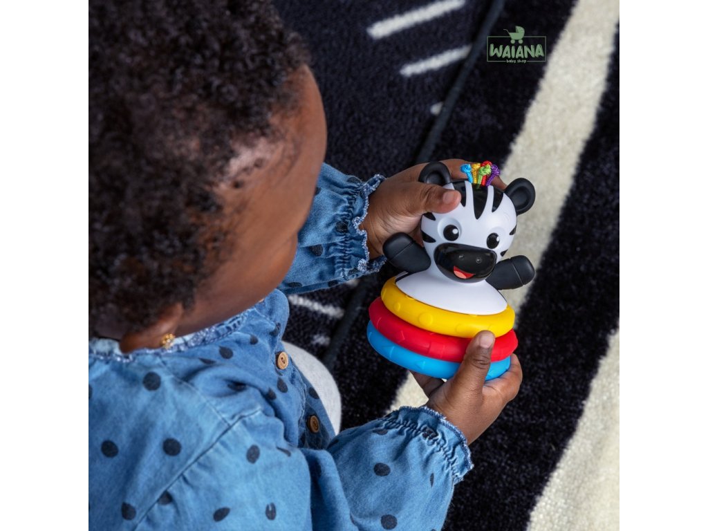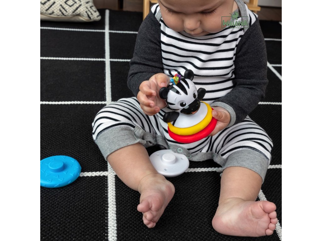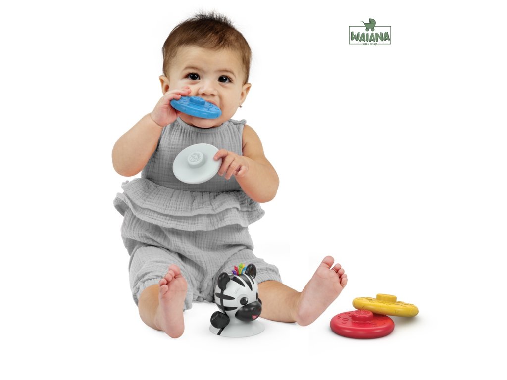 Táto farebná vŕzgajúca hračka pomáha podporovať učenie sa dieťaťa o príčinách a následkoch. Jasne farebné krúžky bez obsahu BPA majú textúru, ktorá upokojuje boľavé ďasná a pomáha budovať prvé zmyslové zručnosti dieťaťa. S motívom zebry Zena z relácií a kníh Baby Einstein si menšie detičky zamilujú búchanie do odkladača, aby sa Zen pohupoval, čo podporuje učenie sa príčiny a následku. Pomocou 4 odnímateľných diskov môžete staršie detičky učiť základné farby, počítanie a skladanie na seba.