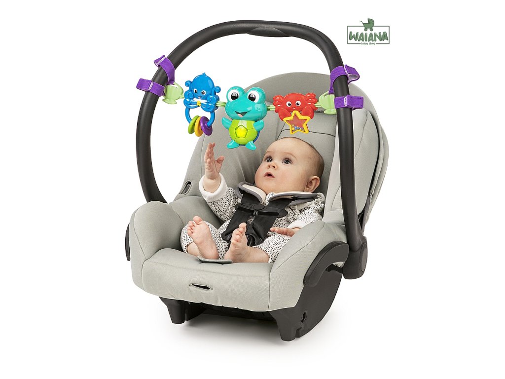 Dvojúčelová hrazda s hračkami sa pripája na podložku na hranie a vaničku na kočíku