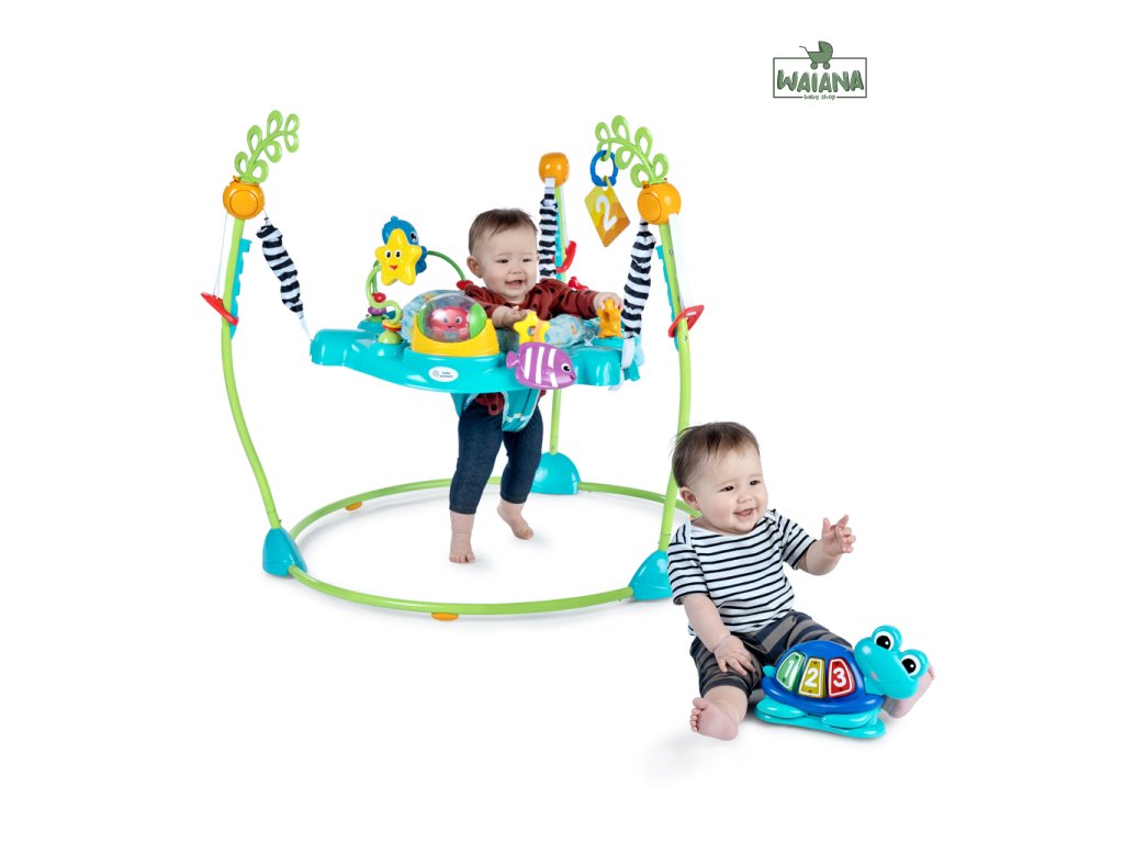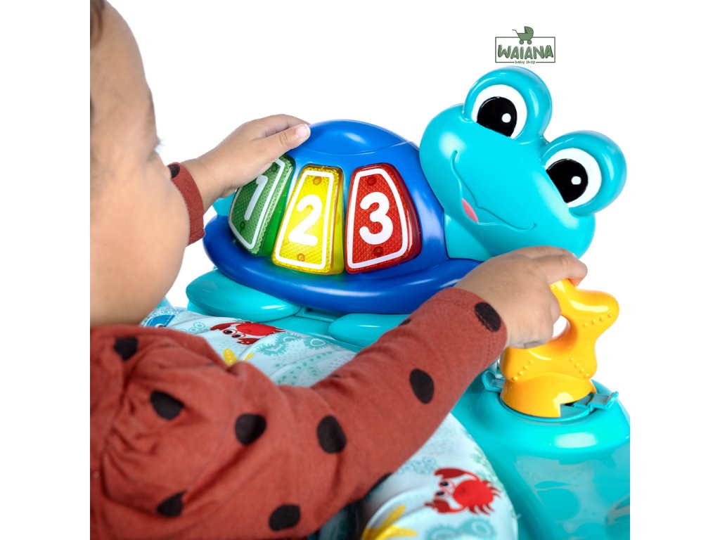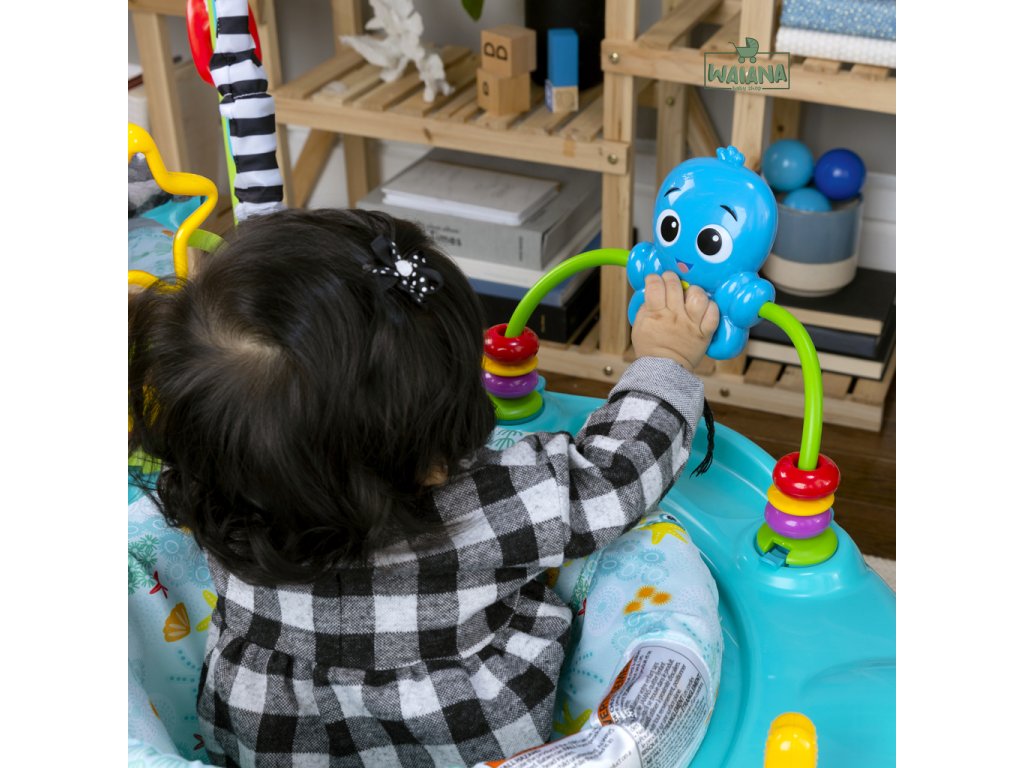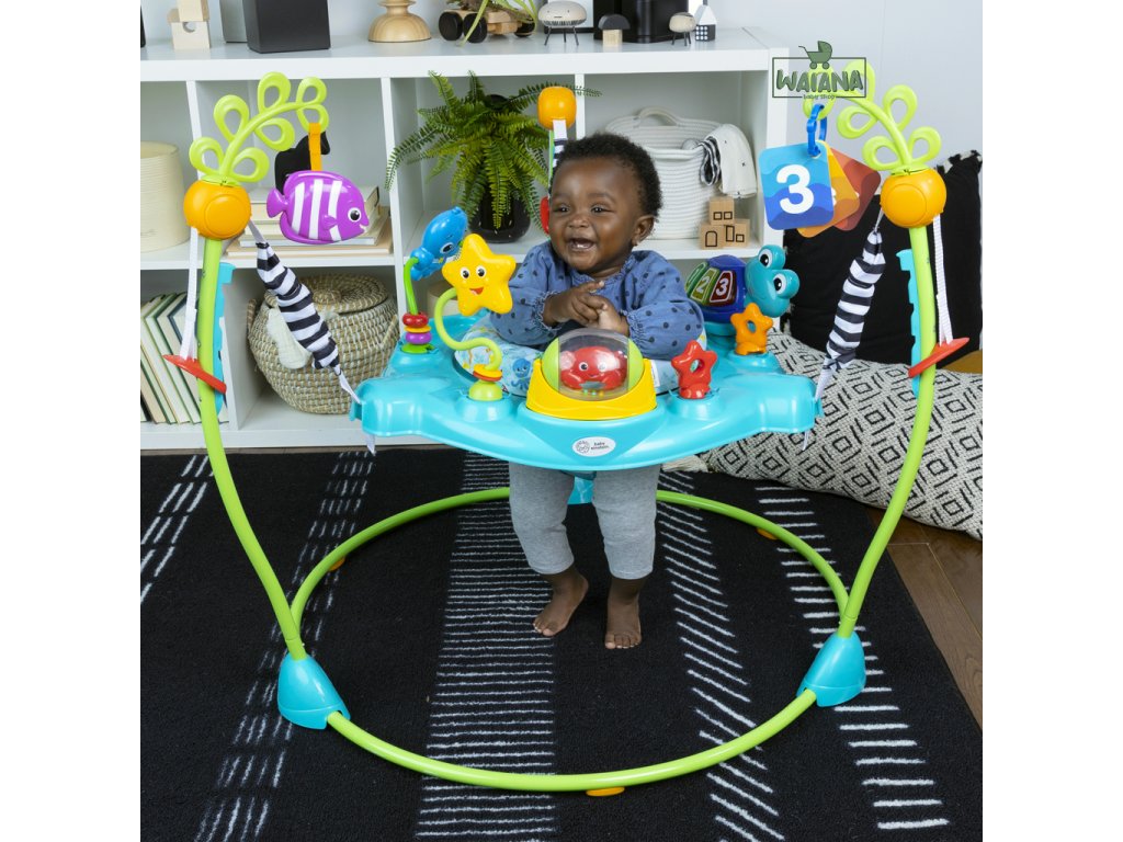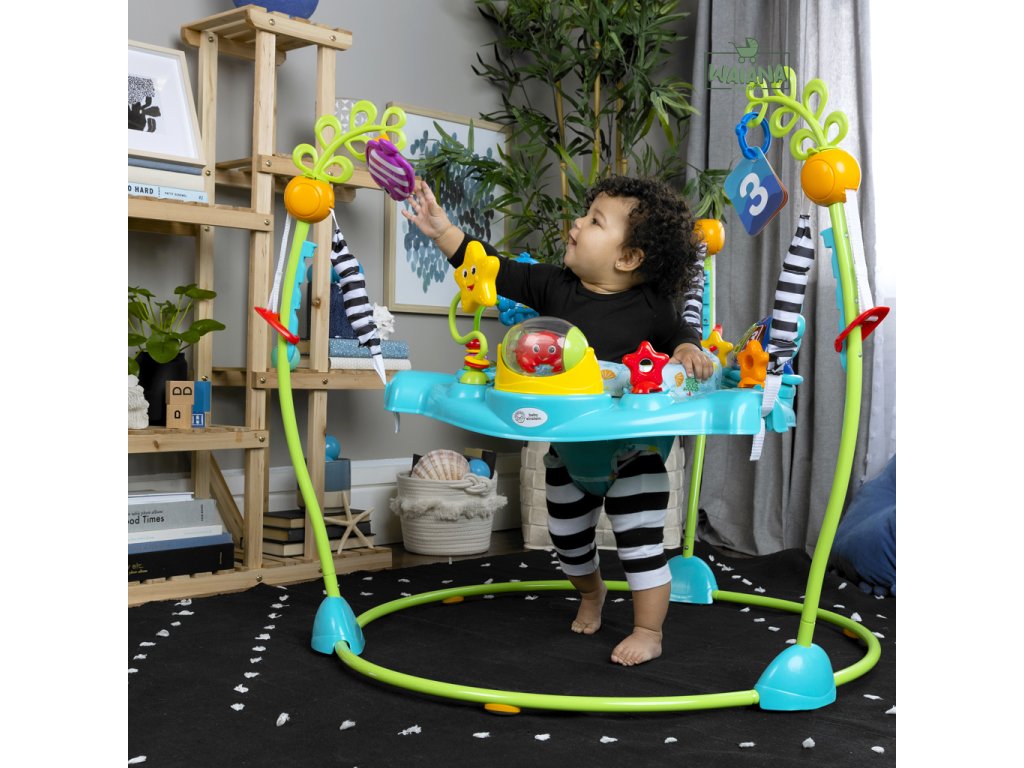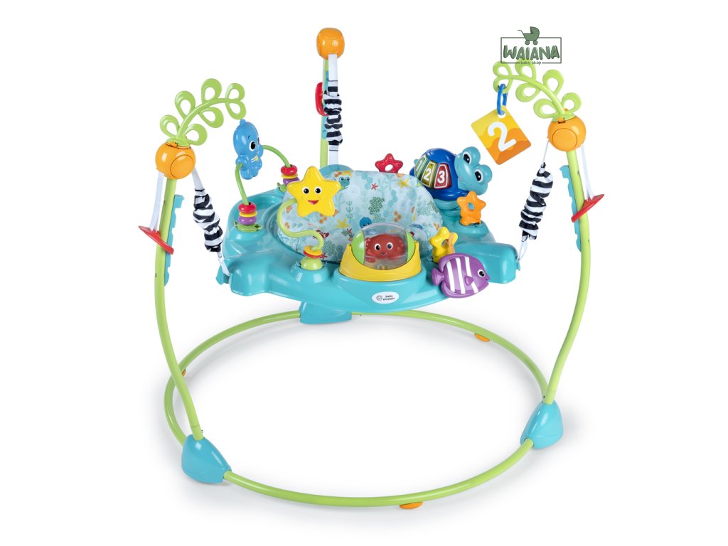 Podporte more učenia so skákadlom 2v1 Baby Einstein Ocean Explorers Curiosity Cove. S otočným sedadlom o 360 stupňov môže bábätko objavovať pohľady a zvuky oceánu zo všetkých strán, zatiaľ čo skáče, skúma a hrá sa s týmto skákadlom s motívom oceánu a odnímateľnou hračkou. Tri herné režimy pomáhajú bábätku objavovať melódie, stimulujú zmysly a učia farby a čísla v 4 jazykoch – angličtine, francúzštine, nemčine a španielčine. Melódie a svetielka zapájajú bábätko počas skákania a elektronická hračka Neptune the Turtle (korytnačka Neptún) ponúka ďalšie učenie pri hre na zemi alebo na cestách. Štyri nastaviteľné výšky jednoducho prispôsobia skákadlo rastúcemu bábätku, čím mu poskytnú bezpečný priestor na objavovanie a hranie od 6 mesiacov do 1 roka alebo do 11,3 kg.