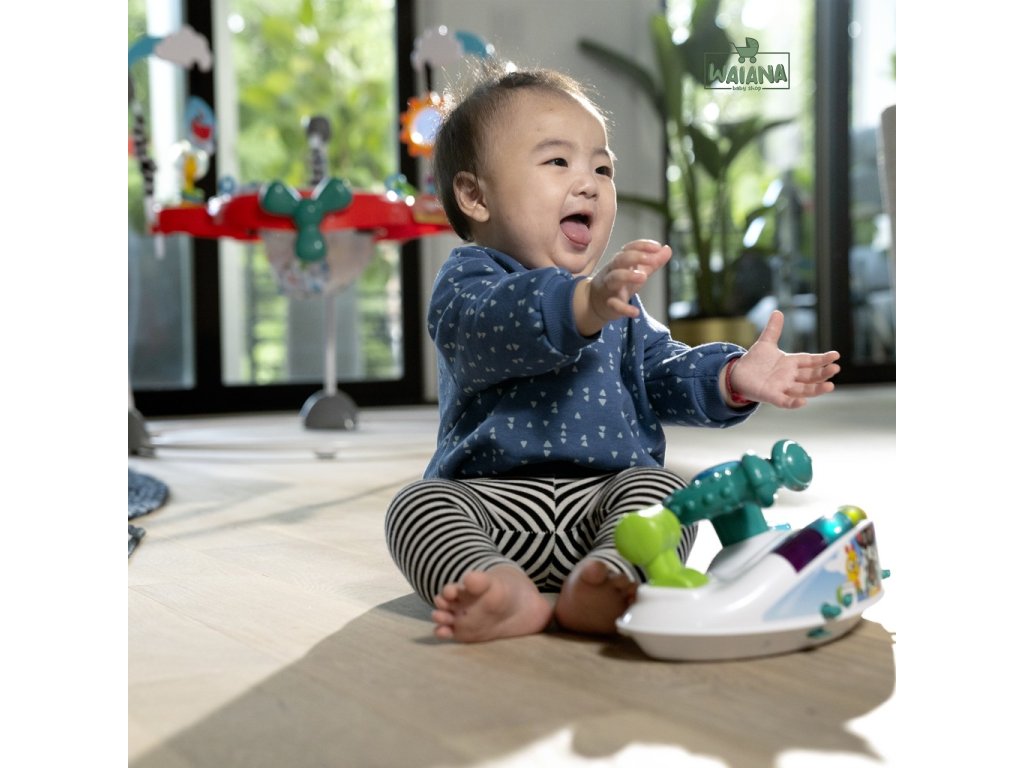 Dieťatko pri každom odraze aktivuje pesničky a svetlá, aby sa dostalo do zmyslovo stimulujúceho vzletu. Odnímateľný elektronický hrací pultík obsahuje 10 interaktívnych komponentov vrátane 7 tlačidiel, plynu a volantu, ktoré pomáhajú dieťaťu pilotovať. Dieťa sa môže učiť tvary, farby a čísla v 4 jazykoch - angličtine, španielčine, francúzštine a nemčine. 7 multisenzorických hračiek a aktivít zapája vývojové zručnosti, ako sú príčina a následok a zručnosť. Obľúbené postavičky Baby Einstein Ocean Explorers, ako Cal, Zen a Neptún, slúžia dieťaťu ako kopiloti.