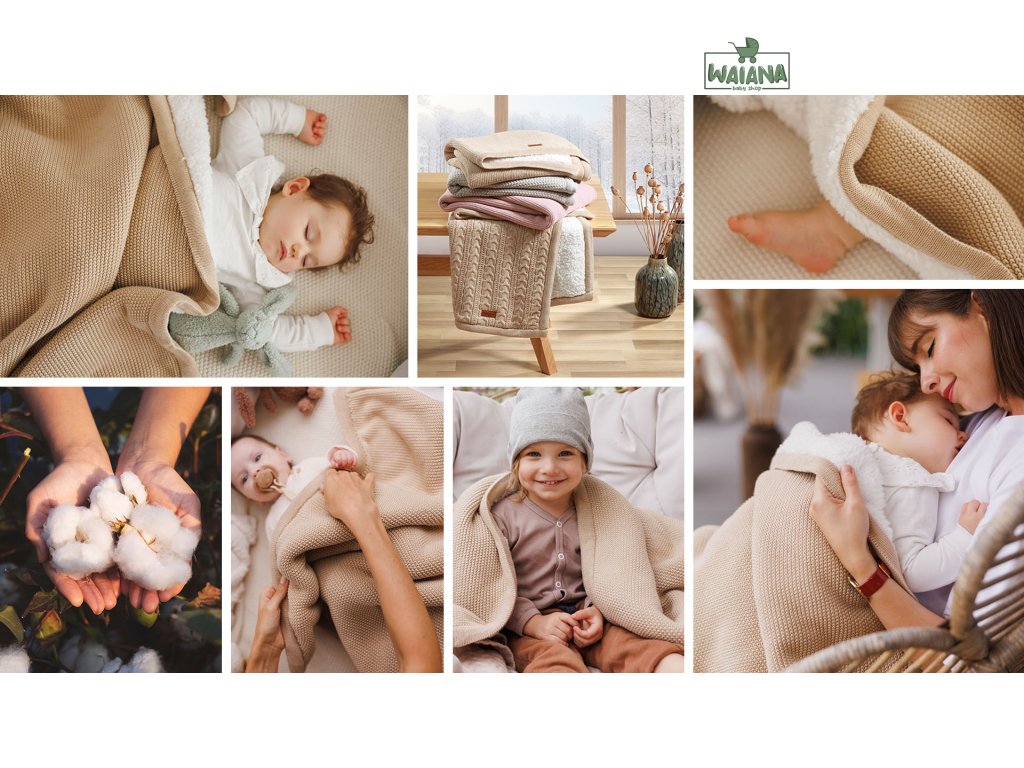 Táto dvojvrstvová deka je ideálnou voľbou pre chladnejšie dni. Vrchná vrstva je vyrobená z prírodnej bavlny – jemnej a bezpečnej pre citlivú pokožku dieťaťa. Spodná strana je podšitá hustou sherpa látkou (flísom), ktorá pripomína jahňaciu kožušinu a výborne izoluje teplo. Deka nedráždi pokožku, vytvára pocit bezpečia a pohodlia, takže vaše dieťa sa bude cítiť ako v mäkkom, teplom obláčiku. Ideálna pre novorodencov, dojčatá aj staršie deti – doma, na prechádzkach či na cestách.