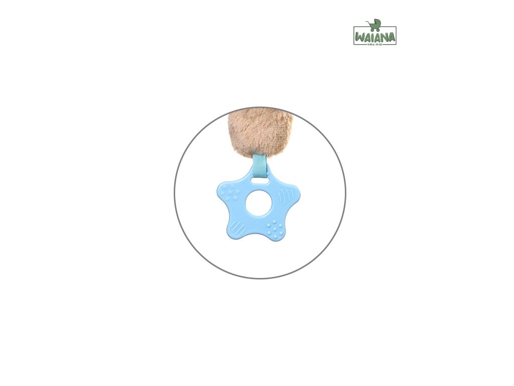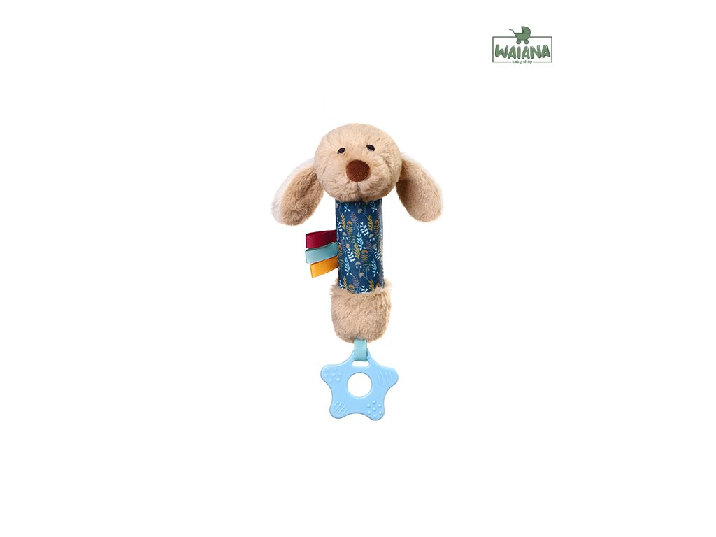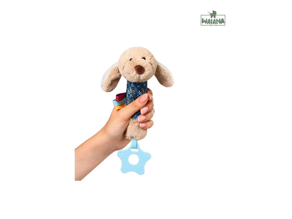 Psík je dodávaný s praktickou hryzačkou, ktorá mu pomôže počas náročného obdobia prerezávania zúbkov.
