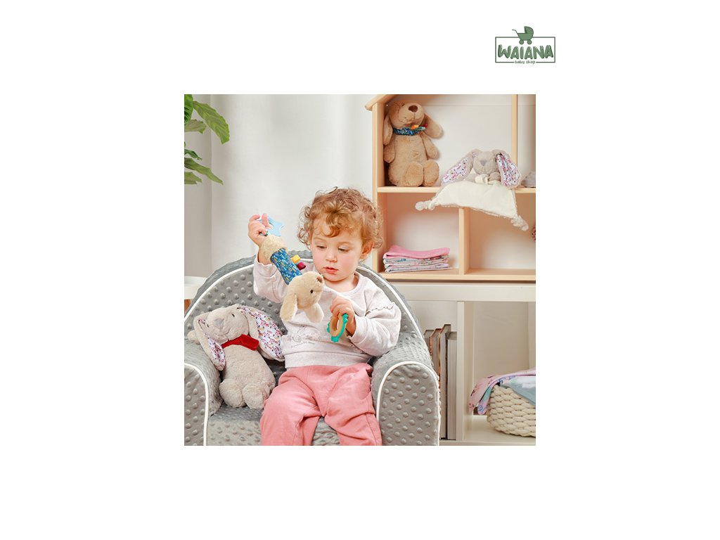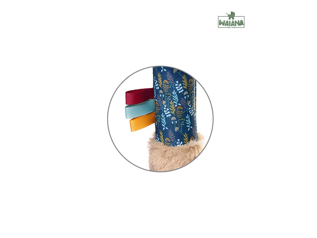Mäkké ušká povzbudzujú dieťatko k dotyku, zatiaľ čo farebné štítky mu umožňujú rozvíjať malé ručičky.