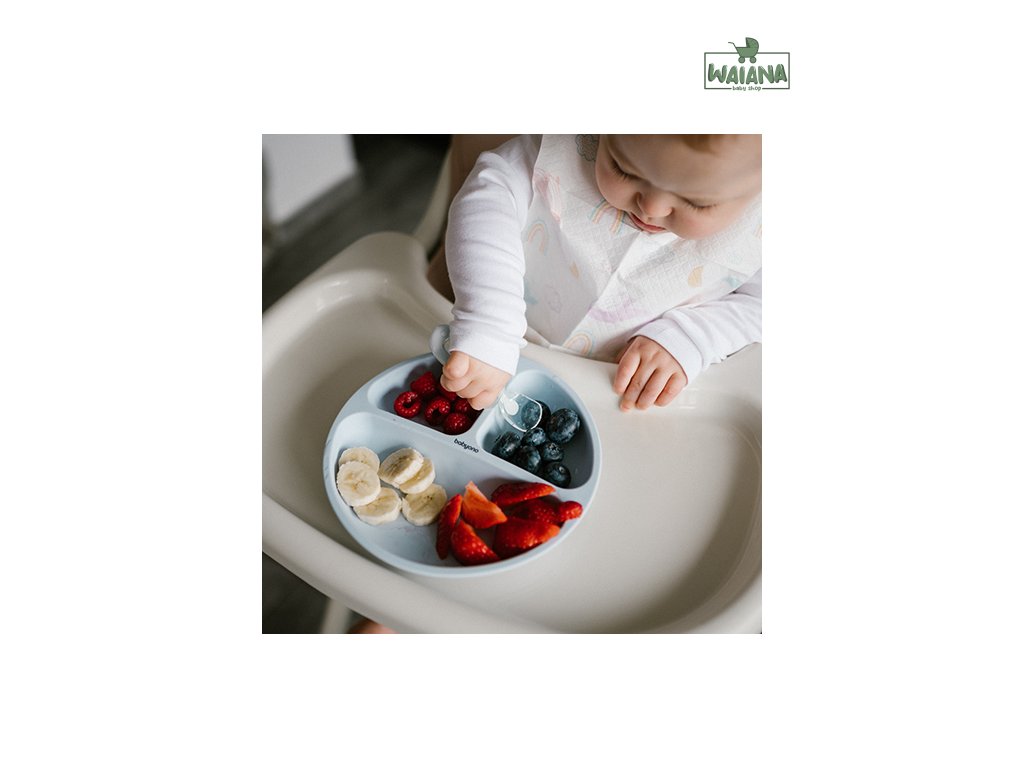 Vďaka prísavke na spodnej časti je nízke riziko rozliatia alebo pádu taniera. Ergonomický tvar taniera uľahčuje deťom prijímanie jedla a prvé kroky pri stolovaní. Tri praktické priehradky povzbudzujú dieťa, aby vyskúšalo nové potraviny a chute. Tanier je vyrobený z vysoko kvalitného silikónu, je zdravotne nezávadný a ľahko sa čistí. Dá sa umývať v umývačke riadu a predhrievať v mikrovlnnej rúre.
