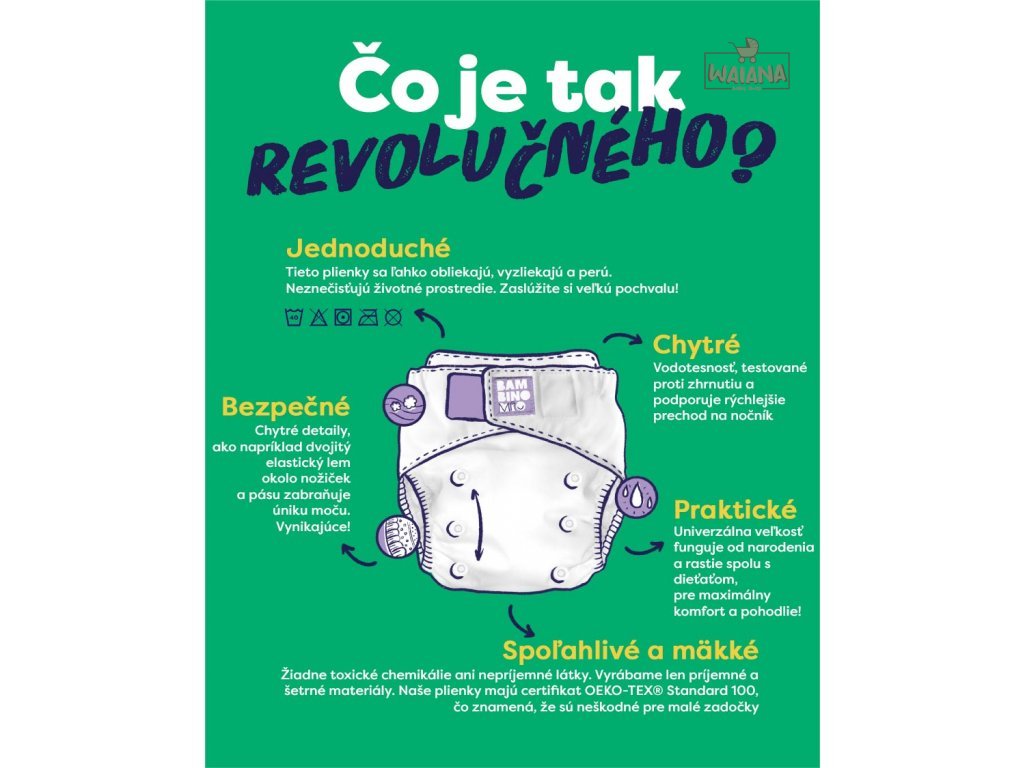 - Sú opakovane použiteľné plienky - neobsahujú škodlivé materiály a sú vybavené nastaviteľnými cvočkami, priedušnými absorpčnými tkaninami, vodeodolnou vrstvou a nepriepustnou konštrukciou.