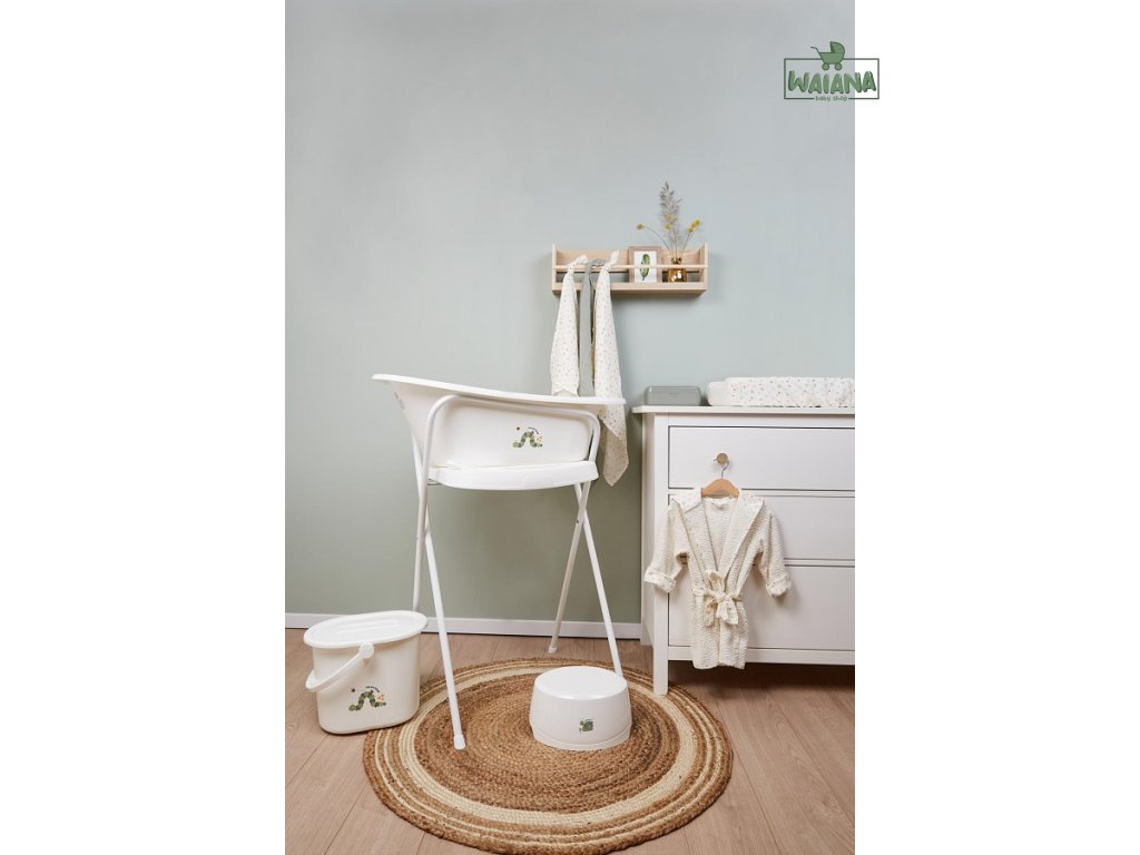 Kúpanie bábätka patrí k najobľúbenejším večerným rituálom. Ak máte stojan nemusí sa nutne odohrávať v kúpeľni. Niekedy sa pekne pretiahne a tak je dôležitá správna výška vaničky na správne držanie tela a tiež mať všetko na dosah a nemusieť od kúpaného dieťaťa odchádzať. Stojan Click od Bébé-jou je preto vybavený integrovaným držiakom uteráka alebo županu a miestom na položenie mydla alebo kúpacích gélov a šampónov. Nikdy nenechávajte dieťa pri kúpaní bez dozoru.