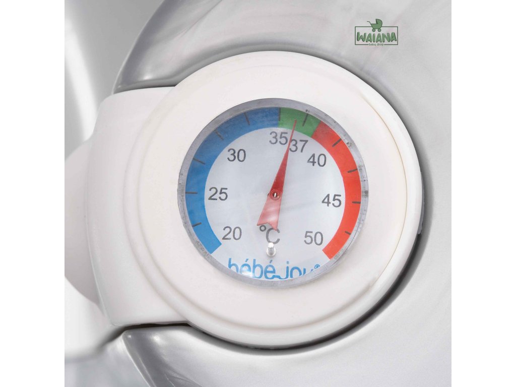 Cieľom Bébé-Jou je vytvárať bezpečné výrobky pre každodenné chvíle, ktoré si môžu rodičia a deti navzájom užiť. Či už je to večerný kúpeľ alebo prvé chvíle učenia na nočník, práve tieto obyčajné chvíľky urobia deň niečím výnimočným! Preto sme vytvorili pohodlnú certifikovanú detskú termovaničku, ktorá je k dispozícii v mnohých krásnych farbách a designoch. Luxusné Bébé-Jou termovanička sa odlišuje svojou funkcionalitou a štýlom. Jediným pohľadom si môžete prečítať presnú teplotu vody a neustále ju monitorovať s presnosťou jedného stupňa. Ďalej má termovanička má dva integrované zásobníky na mydlo a šampón. Týmto spôsobom budete mať všetko po ruke a pri kúpaní nemusíte hľadať kde sa potrebné veci zatúlali. Nikdy sa tak nestane, že by ste nechali dieťa vo vaničke bez dozoru, čo je častou príčinou jeho zranenia. Termovaničku ľahko a bezpečne jediným kliknutím umiestnite na kompatibilný stojan. Vypustiť ju môžete vďaka zabudovanému vypúšťaciemu systému. Vyrobené v Holandsku.