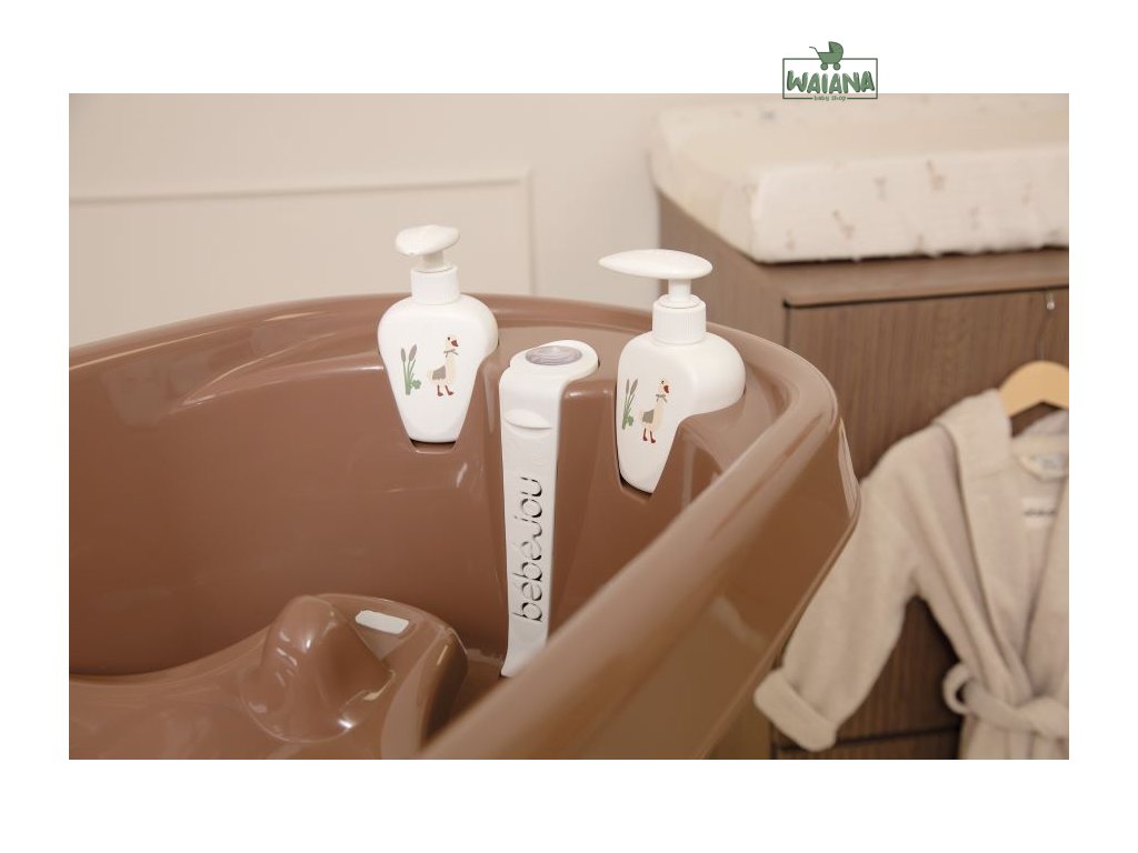 Unikátna termovanička Bébé-Jou s monitorovaním teploty vody a dávkovačom mydla a šampónu. Komfortná a starostlivo konštruovaná termovanička Bébé-jou je vybavená inovatívnym Click systémom pre ešte väčšiu bezpečnosť a pohodlie pri kúpaní. Len 2 kliknutia a vanička je ľahko a bezpečne umiestnená na kúpací stojan. Rovnako ľahko môže byť pomocou kliknutia vanička zo stojana odpojená.