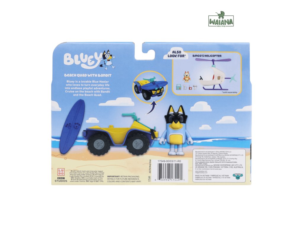 BLUEY Bandit s Plážovým Quadom - štvorkolkou je hrací set inšpirovaný obľúbeným animovaným seriálom "Bluey". Tento dobrodružný set umožňuje deťom pripojiť sa k Banditovi, jednej z postáv zo seriálu, pri objavovaní vzrušujúcich dobrodružstiev na pláži s jeho plážovým quadom.