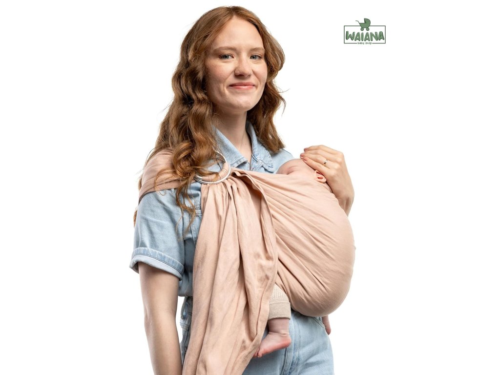 Jednoduché a Rýchle použitie: Je to Ring Sling bez viazania – stačí pretiahnuť látku cez krúžky a dotiahnuť.