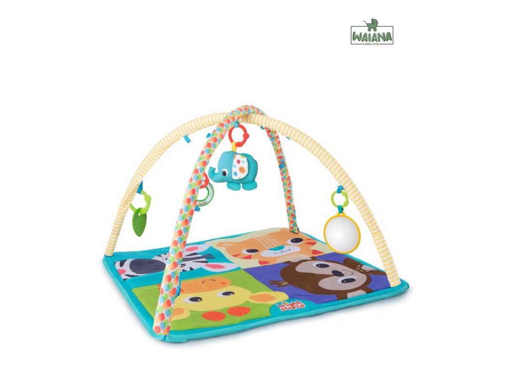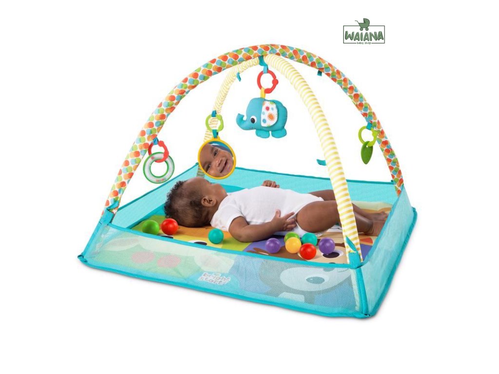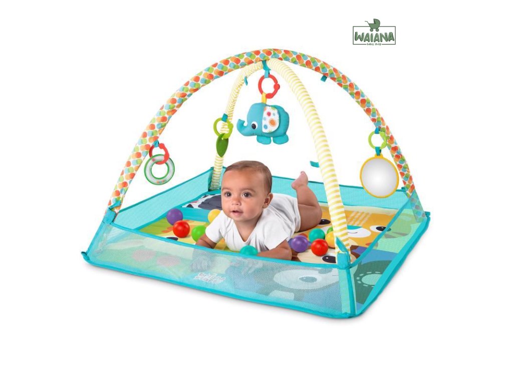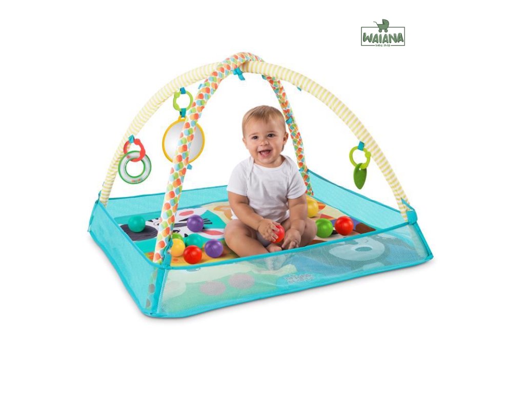 76-centimetrová hracia deka poskytuje útulný povrch pre hranie na zemi, steny tejto sviežej, zábavnej a farebnej deky sa dajú nastaviť nahor alebo nadol, steny pôsobia ako bariéra počas hry, aj hry na brušku a pomáhajú udržať 10 farebných loptičiek vždy poruke a na dosah pre dieťatko.