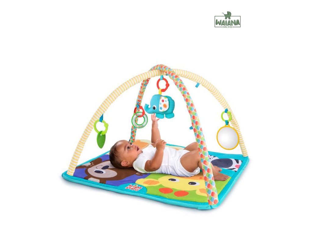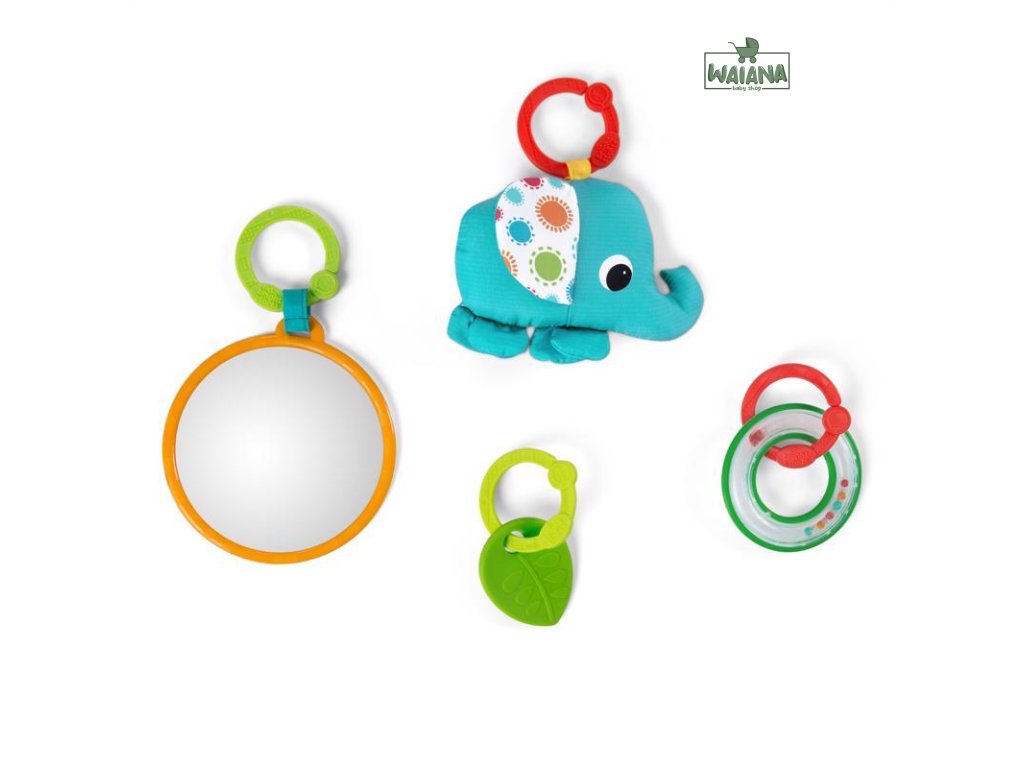 Hrazdička obsahuje 4 odnímateľné hračky, ktoré pomáhajú trénovať motorické schopnosti dieťatka. Hračky zahŕňajú plyšového sloníka s rolničkou pre sluchovú stimuláciu, krúžok naplnený farebnými guličkami, bezpečnostné zrkadlo pre sebaobjavovanie a hryzačku v tvare listu. Detské hračky sú kompatibilné s inými produktmi značky Bright Start, ktoré majú k dispozícii C-krúžok.