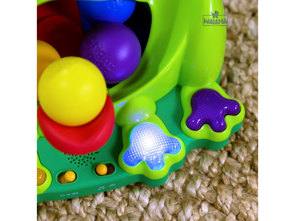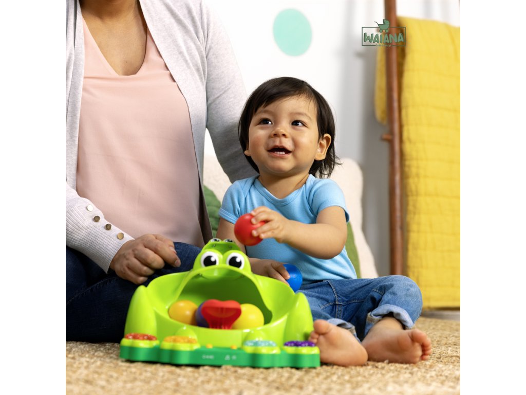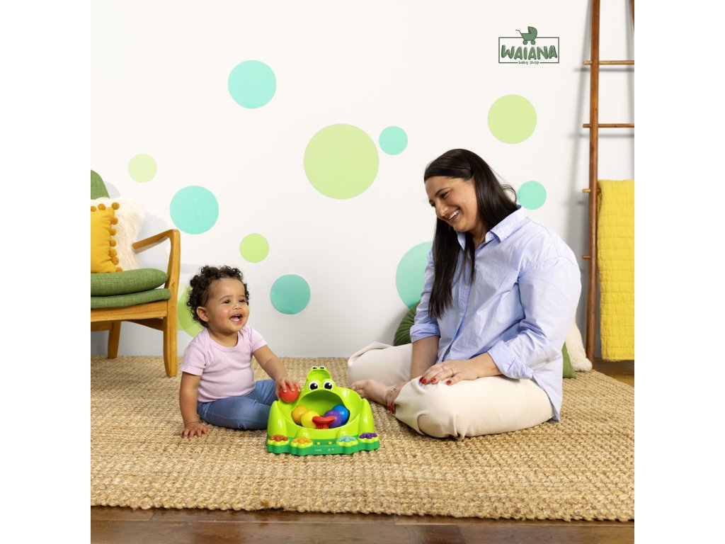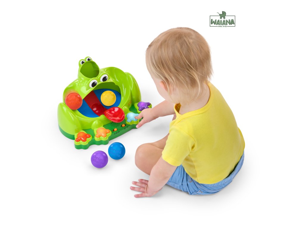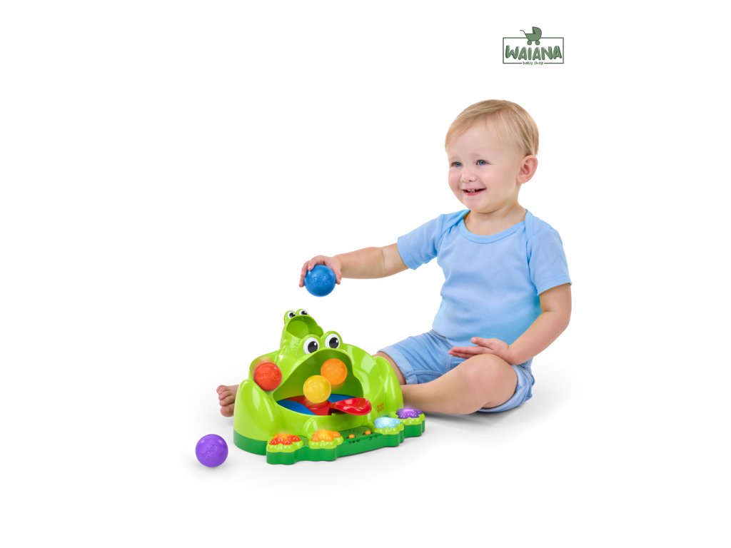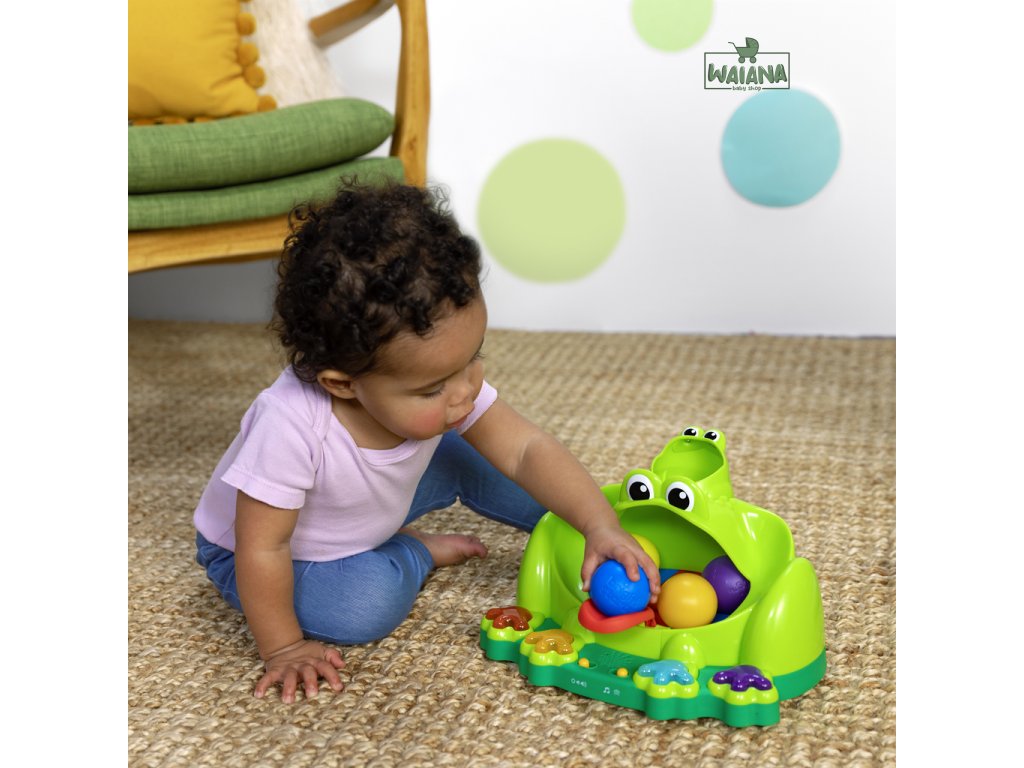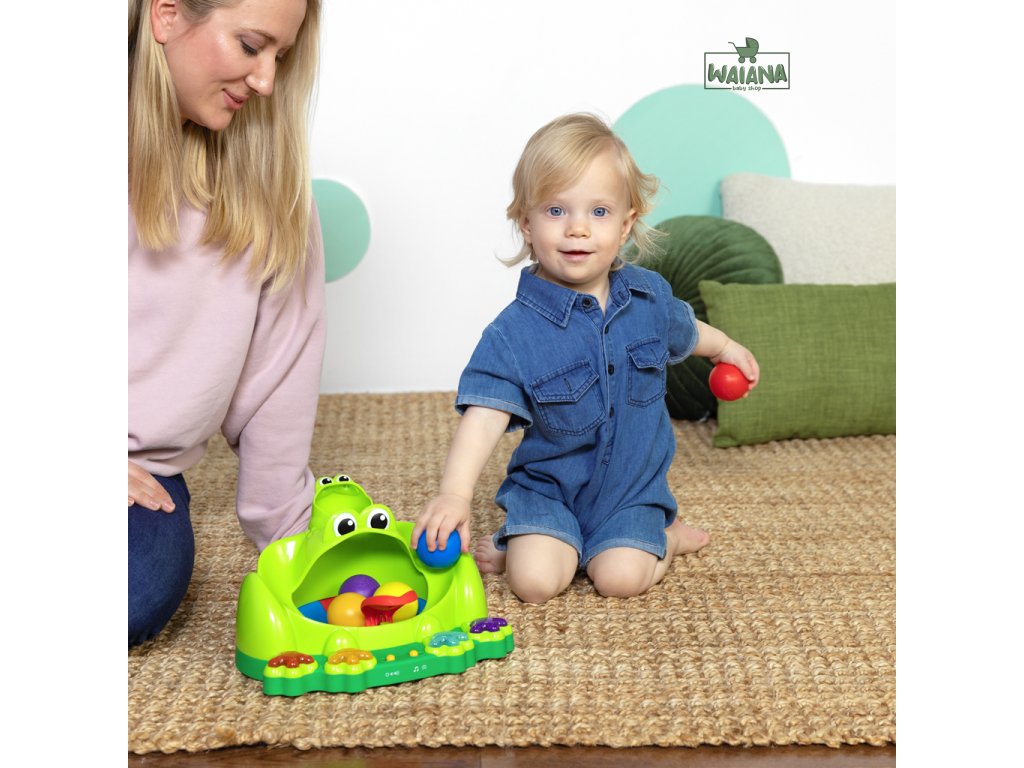Hračka Poppin’ Ball Frog prináša nekonečný smiech a zábavu so svojimi skákajúcimi loptami, hravými svetlami a zábavnými zvukmi. Podporuje plazenie, keď sa dieťa snaží dohnať loptičky! Nakŕmte priateľského žabiaka jednou z 5 loptičiek a sledujte ako skáču na zabudovanej trampolíne v jeho ústach. Žabiak zabáva deti štyrmi spôsobmi hry – hádzanie, vystreľovanie, kotúľanie a stláčanie – táto interaktívna hračka podporuje učenie príčiny a následku, pričom zabaví dieťa na celé hodiny. Navrhnutá pre deti od 6 mesiacov je ideálnym doplnkom do vašej zbierky detských hračiek. Hra s loptami je osvedčený spôsob ako deti a batoľatá rozvíjajú svoje schopnosti, zatiaľ čo sa skvele zabávajú. Skvelá hračka na darovanie pri príležitostiach ako narodeniny, sviatky alebo len tak – tento žabí kamarát si určite získa srdce vášho dieťaťa! Ľahko sa udržuje v čistote pomocou vlhkej handričky a jemného mydla.