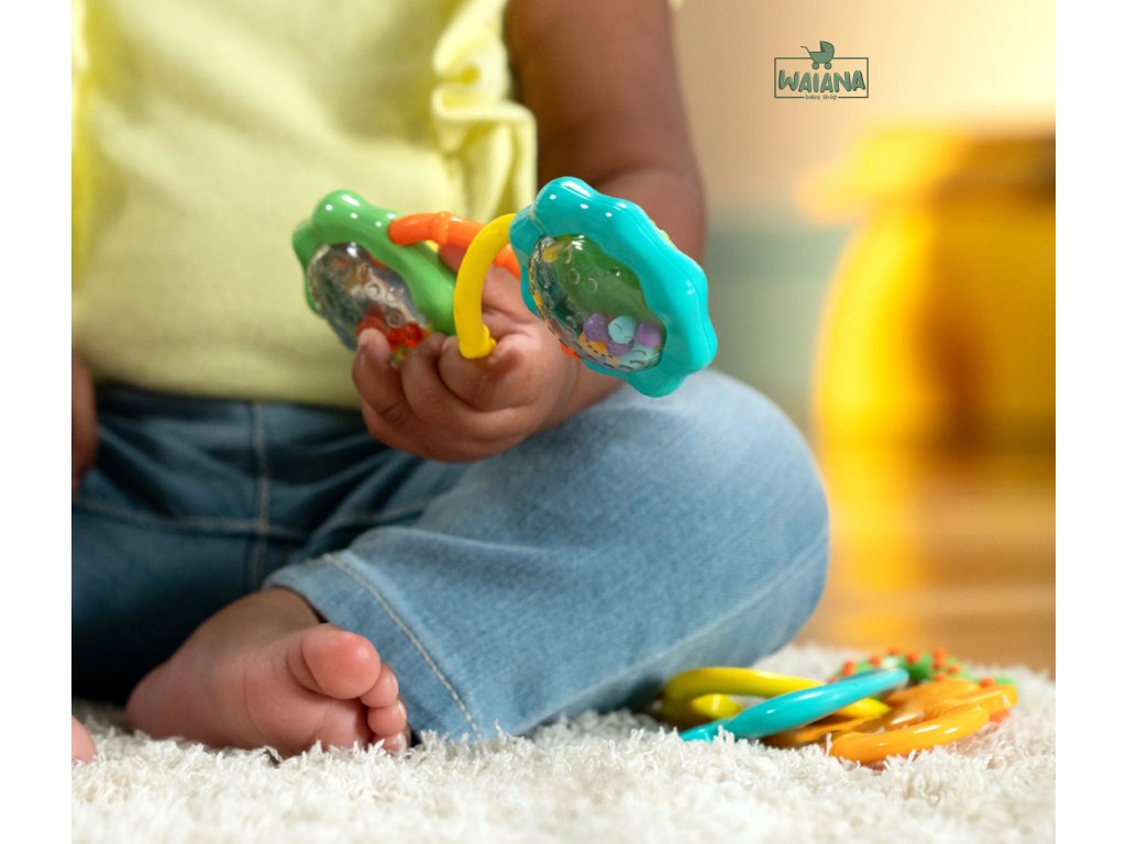 - Rattle & Shake Barbell: Úsmev je len jedno „š-š-š“ zatrasenie ďaleko! Textúrovaná rúčka sa bábätku dobre drží a zrkadlová hrkálka s farebnými korálkami pritiahne jeho pozornosť.