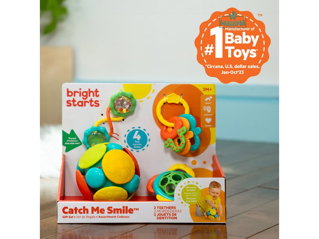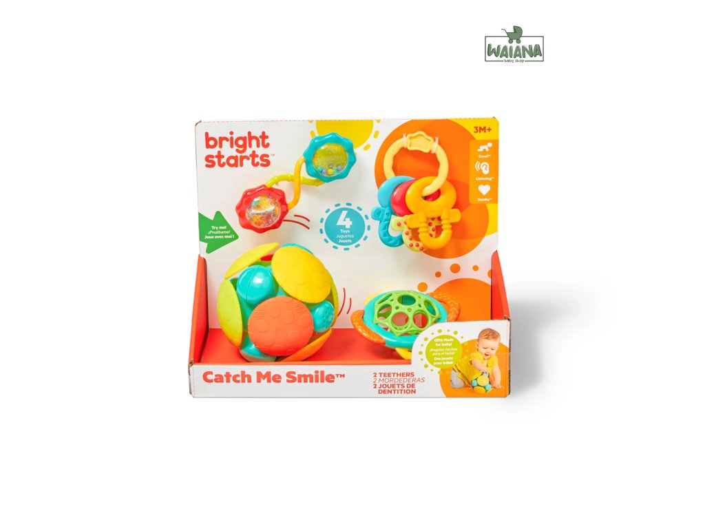 Balíček radosti s darčekovou sadou Catch Me Smile je set hračiek plný nevyhnutností pre rodičov a obľúbených detských hračiek. Ľahko uchopiteľné rúčky, hrkajúce korálky a zrkadlové povrchy robia z hrkálky Rattle & Shake Barbell perfektný doplnok do hracieho boxu alebo prebaľovacej tašky na cesty. Keď sa začnú prerezávať prvé zúbky, dve priložené hryzačky zachránia situáciu! Rôzne výstupky a textúry na hryzačke Grasp & Teethe pomáhajú upokojiť boľavé ďasná, a vďaka uchopiteľnému materiálu Oball a otvorom na prsty si ho bábätko ľahko udrží samo. Tri farebné kľúče License to Drool ponúkajú množstvo plôch na hryzenie. Ako bábätko rastie, elektronická loziaca hračka Wobble Bobble sa kotúľa a motivuje ho k pohybu! Vaše bábätko v období prvého plazenia si túto hračku na naháňanie zamiluje.
