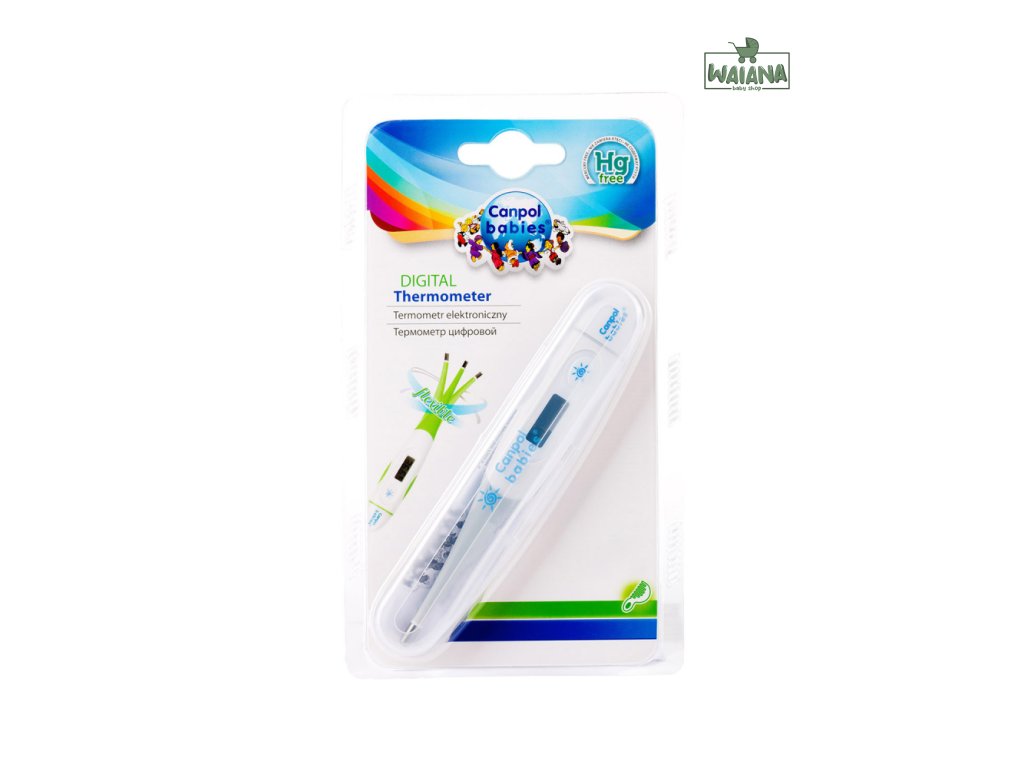 Teplomer novej generácie od Canpol babies zmeria telesnú teplotu dieťaťa v priebehu pár minút. Je vybavený digitálnym displejom, ktorý umožňuje presné meranie teploty. Disponuje zvukovým signálom, ktorý vždy upozorní na dokončenie procesu merania. Rozsah merania 32,0 - 42,9 °C. Súprava obsahuje tiež praktické puzdro na hygienické skladovanie. Mäkká, ohybná koncovka teplomera neporaní dieťa v priebehu merania a umožňuje merať teplotu všetkými tromi spôsobmi.