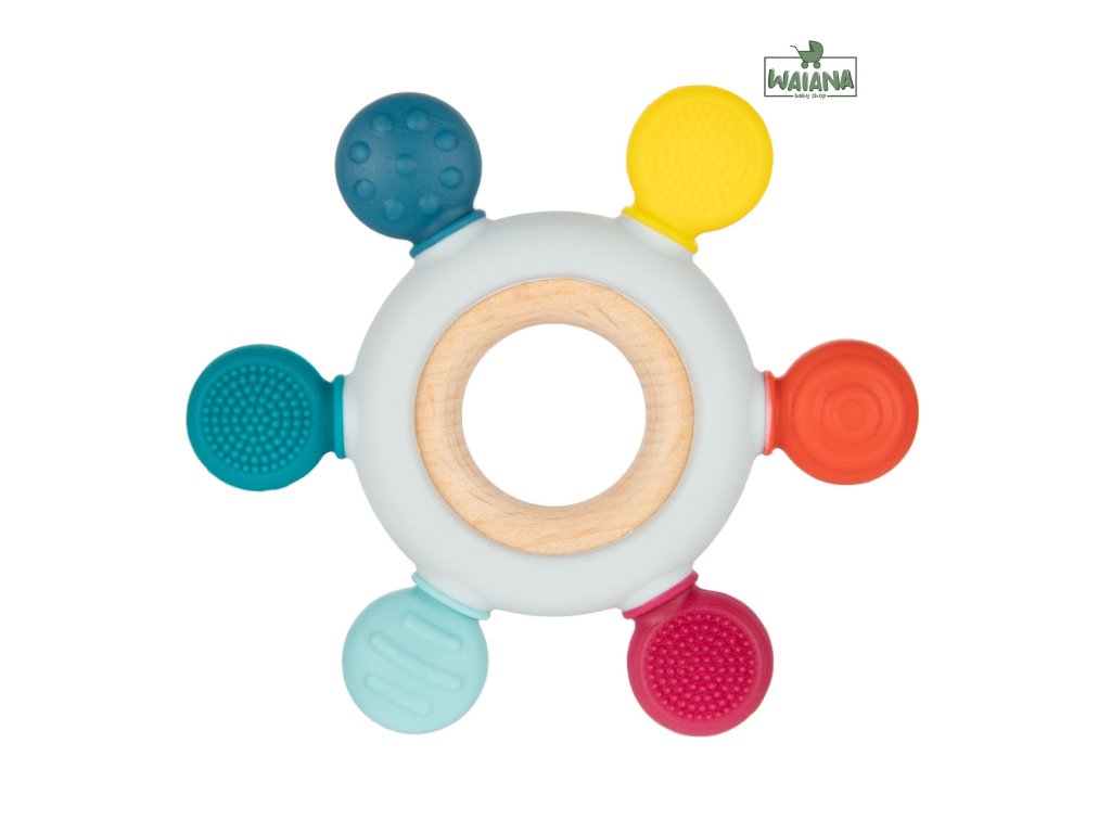 Rôzne tvrdosti hryzačky – silikónové a drevené prvky.