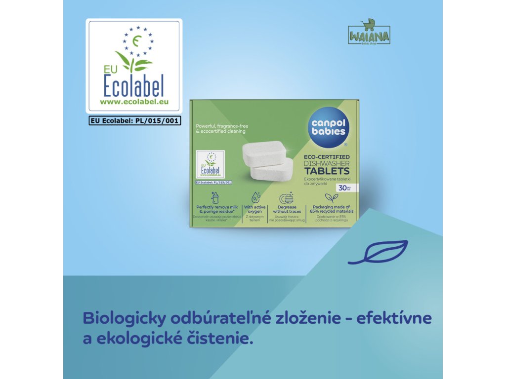 Ekologicky certifikované tablety do umývačky Canpol babies vynikajú úplne biologicky rozložiteľným zložením bez vôní a škodlivých chemikálií, ako sú formaldehyd, reaktívne chlórové zlúčeniny, boritany, EDTA alebo mikroplasty Výrobok je bezpečný pre užívateľov a šetrný k prírode8 recyklovateľné.