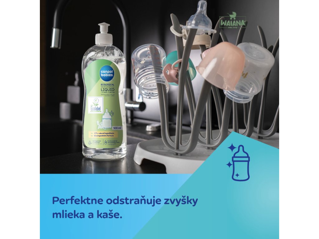 Ekologický umývací prostriedok na dojčenské fľaše a cumlíky bol vyrobený s ohľadom na zdravie a bezpečnosť dieťaťa. Je hypoalergénny, bezfarebný a obsahuje 97% prírodných zložiek. Účinne odstraňuje všetky zvyšky mlieka, džúsov, kaší a potravín. Perfektne sa oplachuje. Umývací prostriedok je jemný k rukám, má neutrálne pH pre pokožku a bol dermatologicky testovaný. Na účinné vyčistenie dojčenského príslušenstva, ako sú fľaše, cumlíky, cumlíky, detský riad, hračky a časti odsávačky mlieka, stačí malé množstvo umývacieho prostriedku. Canpol babies Ekologický umývací prostriedok na dojčenské fľaše a cumlíky je certifikovaný environmentálnou značkou EÚ – oficiálnou európskou značkou udeľovanou produktom, ktoré sú šetrné k životnému prostrediu a ktoré spĺňajú vysoké kvalitatívne a zdravotné štandardy: PL/019/009.