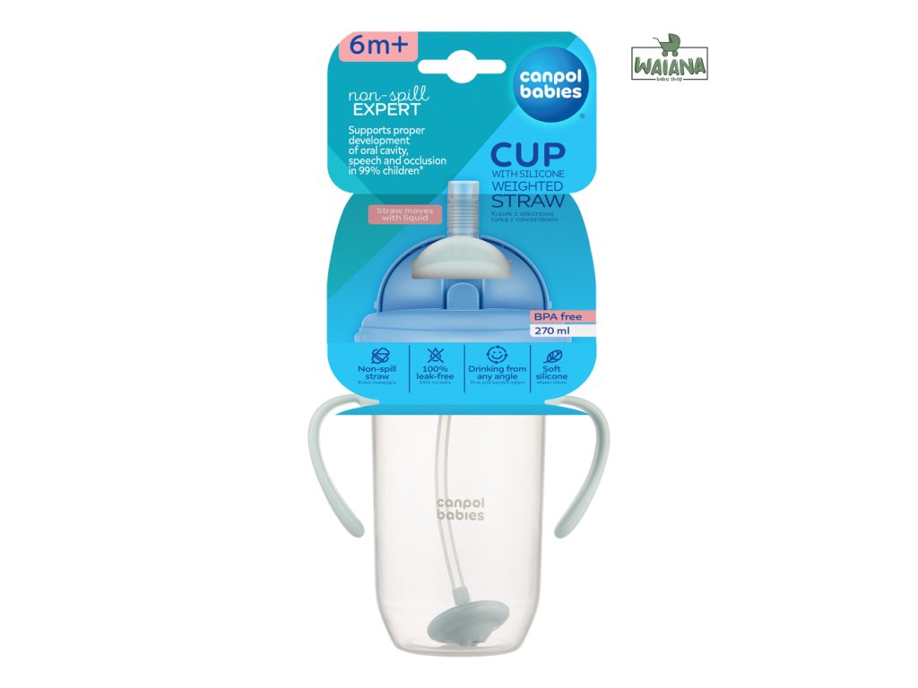 Nový nevylievací hrnček Canpol babies so slamkou a závažím je ideálny na výlety, cesty a prechádzky. Špeciálna membrána v slamke zaisťuje, že tekutina vteká do slamky iba pri pití, čo zabraňuje rozliatiu. Je ideálny pre deti, ktoré sa začínajú učiť samostatne piť. Nevylievací hrnček so slamkou a závažím podporuje správny vývoj úst, reči a oklúzie u 99 % detí.* Závažie na konci slamky nasleduje pohyb tekutiny, takže vaše dieťa môže piť svoj obľúbený nápoj až do poslednej kvapky, bez ohľadu na to, v akom uhle hrnček nakloní. Vďaka viečku je možné slamku rýchlo a pohodlne stiahnuť, čím sa zabráni nekontrolovanému rozliatiu a zaručí 100% tesnosť. Mäkká silikónová slamka je šetrná k citlivým ďasnám dieťaťa. Pre dôkladné vyčistenie môžete slamku rozobrať a umyť. Je dobré si zaobstarať špeciálnu kefu na čistenie slamky aj náhradnú slamku. Nevylievací hrnček Canpol babies je vyrobený z nerozbitného a bezpečného plastu (PP), bez BPA ani iných škodlivých látok. Je trvanlivý, ľahký a odolný proti poškodeniu. Pohodlná rukoväť sa dieťaťu ľahko drží, zatiaľ čo veľký otvor vám pomôže naplniť a umyť hrnček. Možno ho umývať v umývačke riadu i ohrievať v mikrovlnnej rúre. Vhodné pre studené nápoje alebo nápoje izbovej teploty. Praktický nevylievací hrnček Canpol babies so slamkou a závažím 270 ml povzbudí vaše dieťa na pitie vody a na rozvoj správnych návykov. Nevylievací hrnček Canpol babies so slamkou a závažím 270 ml odporúčame pre deti od 6 mesiacov.