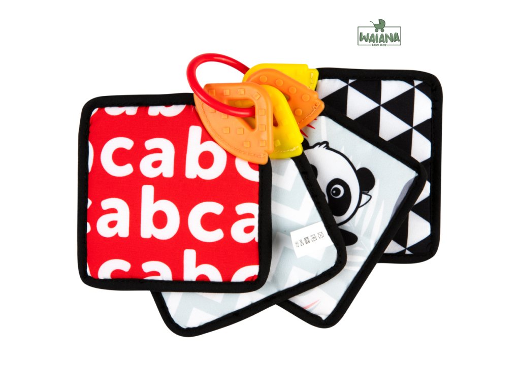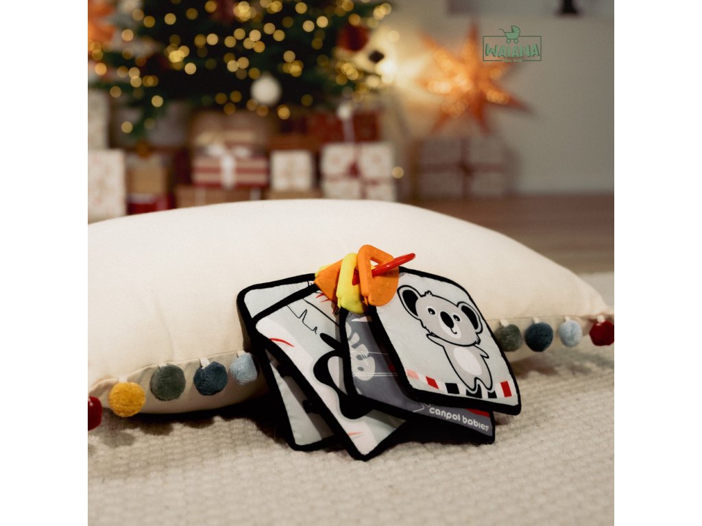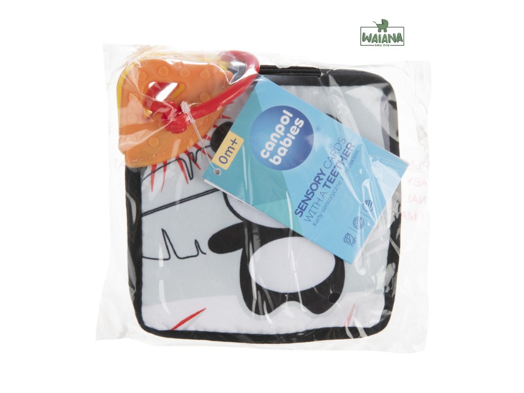 Senzorické karty s jemným kontrastom stimulujú zrak tých najmenších, ktorých svet je hneď po narodení čiernobiely. Novorodenci nevedia rozlišovať farby, vidia iba odtiene šedej a najľahšie vidia veľké, kontrastné čiernobiele vzory. Kontrastné kartičky uľahčujú vášmu dieťatku sústrediť sa na obrázok, na ktorý sa pozerajú, a zároveň im dávajú možnosť budovať vzťahy a blízkosť pri prvých spoločných hrách. Karty sú navzájom spojené plastovým krúžkom, ktorý umožňuje pripevniť hračku na postieľku, kočík, hojdačku alebo autosedačku. Vďaka tomu karty zabaví vaše bábätko nielen doma, ale aj na prechádzke a na cestách. Senzorické karty Canpol babies je možné tiež oddeliť a dať ich jednotlivo k hre. Flexibilná senzorická hryzačka na rohu každej karty poskytnú vášmu bábätku úľavu v období prerezávania zúbkov, masírujú ďasná a upokojujú svrbenie prerezávajúcich sa prvých zúbkov. Karty sú mäkké a vyrobené z materiálu príjemného na dotyk.