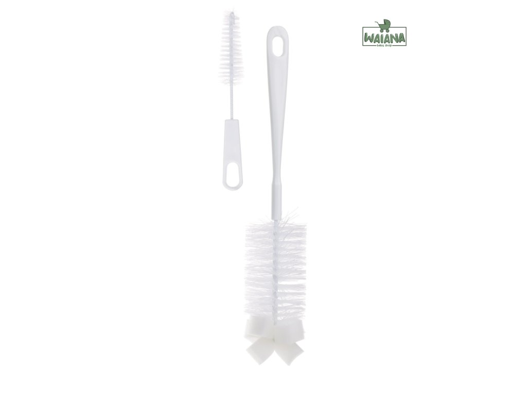 Praktická súprava kefiek uľahčuje dôkladné čistenie vnútra fliaš a cumlíkov. Štetiny kefiek sú zo špeciálneho vlákna, ktoré nepoškriabe povrch. Väčšia kefka má tiež špongiu, ktorá umožňuje dôkladnejšie vyčistenie dna fľaše. Menšia je vhodná na čistenie cumlíka od zvyškov mlieka alebo kaší.