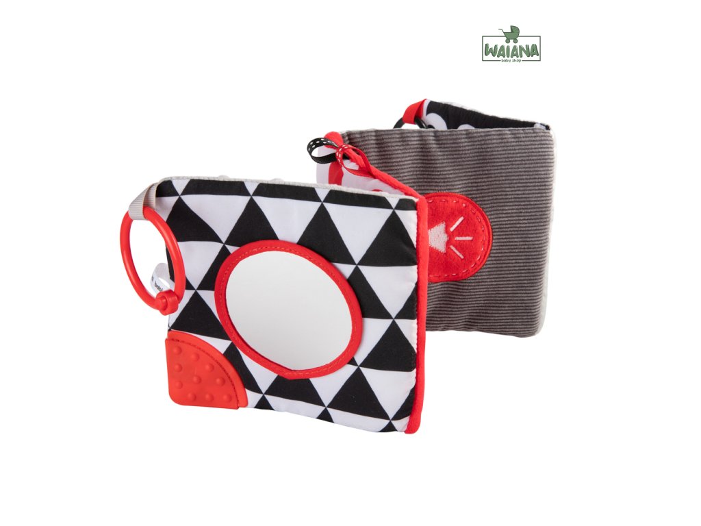 Kontrastná knižka z kolekcie SENSORY TOYS má interaktívne prvky, s ktorými sa dieťa zabaví na dlhý čas. Podporuje rozvoj batoľaťa od prvých dní. Stimuluje zrak vďaka červenej a čiernej farbe – prvým farbám, ktoré novorodenci vidia. Kniha výborne stimuluje rozvoj zrakovej, sluchovej a motorickej koordinácie dieťaťa. Hračka je ideálna na učenie sa uchopovať predmety a objavovať zaujímavé nové zvuky. Zábavná včela so suchým zipsom umožňuje trénovať odopínanie a zapínanie predmetov batoľaťom. Obsahuje hryzačku, pískadlo, hrkálku, šuštivé prvky a niekoľko stužiek. Skryté zrkadlo je ďalším lákadlom – každé dieťa sa rado pozerá okolo seba a pozoruje svet. Praktické háčiky umožňujú upevniť hračku ku kočíku alebo postieľke alebo vytvoriť súpravu so senzorickou podložkou Canpol babies. Knižka je mäkká a príjemná na dotyk. Určené pre deti hneď od narodenia.