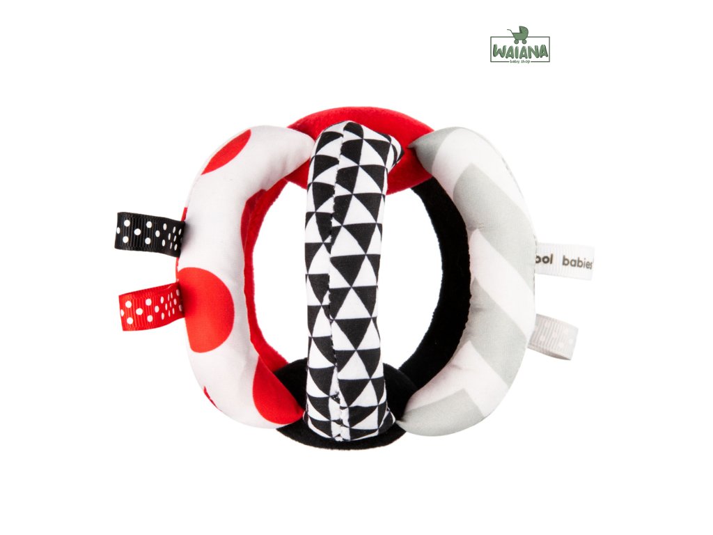 Kontrastná lopta s hrkálkou z kolekcie SENSORY TOYS má interaktívne prvky, s ktorými sa dieťa zabaví na dlhý čas. Podporuje rozvoj batoľaťa od prvých dní. Stimuluje zrak vďaka červenej a čiernej farbe – prvým farbám, ktoré novorodenci vidia. Kniha výborne stimuluje rozvoj zrakovej, sluchovej a motorickej koordinácie dieťaťa. Navrhnuté tak, aby sa batoľa naučilo uchopovať predmety, stimuluje hmat a podporuje objavovanie nových tvarov a zvukov. Obsahuje hrkálku, šuštivé prvky a zaujímavé stužky. Lopta je mäkká a príjemná na dotyk. Hračka sa dá kotúľať a hádzať, čo je prirodzená fáza vývoja dieťaťa. Určené pre deti hneď od narodenia.