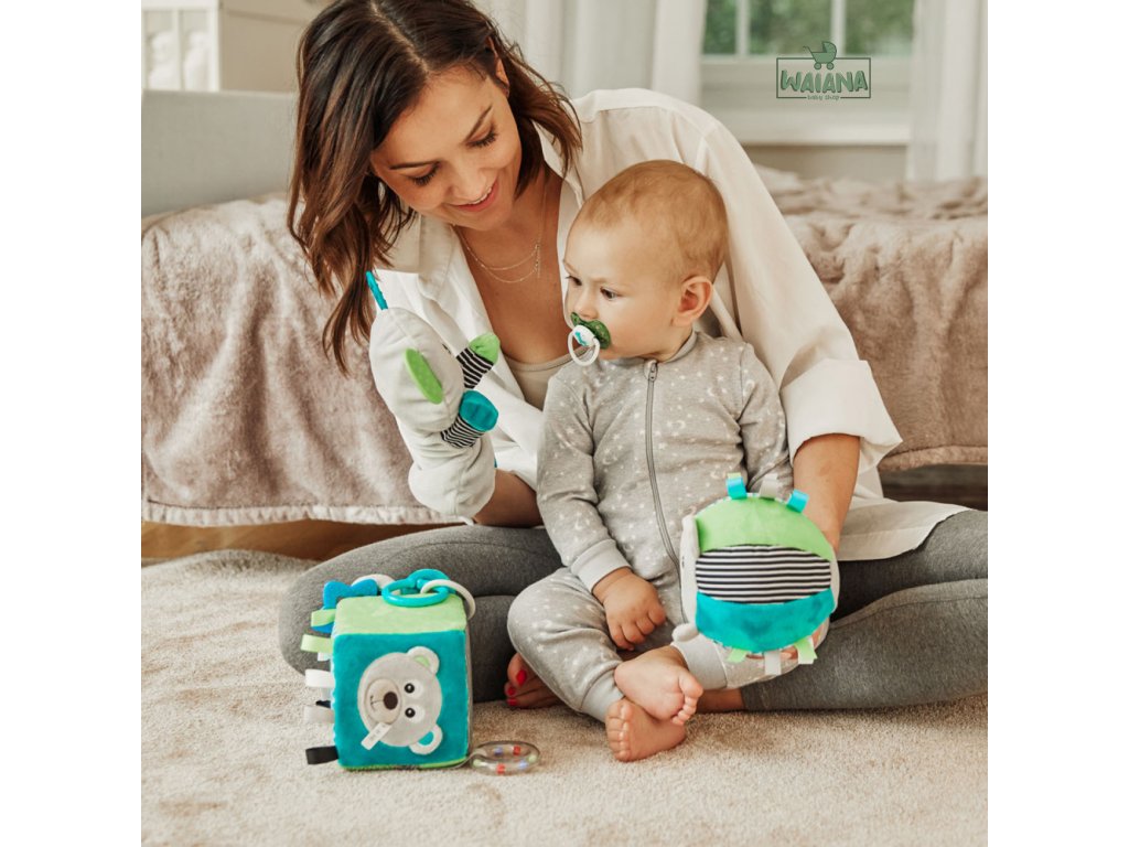 Senzorická kocka Medvedíky je z materiálu príjemného na dotyk s rôznymi textúrami. Stimuluje rozvoj zrakovej, sluchovej a motorickej koordinácie dieťaťa. Hračka ukrýva mnoho prekvapení, ktoré dieťa nadlho zaujmú. Obsahuje zvonček, hrkálku a šuštivé prvky, bezpečné zrkadielko a elastické hryzačky. Univerzálna spona umožňuje upevniť hračku ku kočíku, sedačke alebo postieľke. Hračka je určená pre deti staršie ako 3 mesiace.