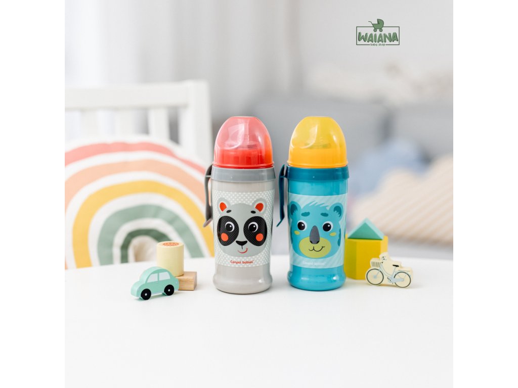Nevylievacia športová fľaša so silikónovou slamkou a s praktickým krytom na ochranu pred zašpinením. Náustok je pripojený k slamke, ktorá uľahčuje pitie z dna fľaše. Nevylievací náustok má vstavanú membránu, ktorá zabraňuje vyliatiu nápoja a umožňuje ovládať intenzitu vytekania tekutiny. Má pohodlnú rukoväť na upevnenie športovej fľaše k opasku. Športová fľaša je z bezpečných materiálov bez obsahu BPA. Objem 350 ml. Vhodné pre deti staršie ako 12 mesiacov.