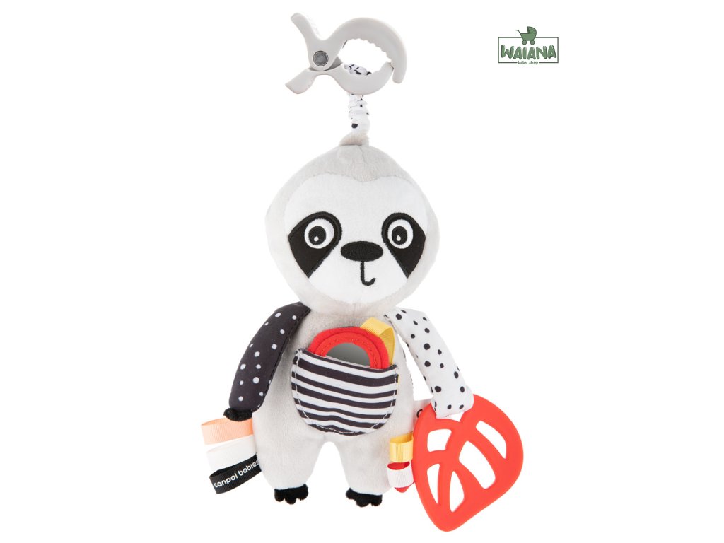 Senzorická interaktívna závesná hračka LENOCHOD s klipom BabiesBoo bude skvelým spoločníkom na prechádzky a cestovanie. Má pohodlnú sponu, ktorá ju umožňuje pripevniť na detský kočík, autosedačku, postieľku a ako doplnkový prvok k zmyslovo vzdelávacej hracej podložke Canpol babies. Doplnkové šuštiace prvky, hryzátko, zrkadlo a jemne zvoniaca hrkálka sú pre dieťa zaujímavé v čase spoznávania sveta. Leňoch bol vyrobený z mäkkých a príjemných materiálov - plyš, menčester, labky plnené "hráškom", našité farebné visačky zaisťujú zmyslové zážitky. Dieťa sa prostredníctvom citlivosti dotyku naučí rôznym štruktúram. Kontrastné farby a vzory podporujú správny vývoj zraku bábätka. Leňochod má na prednej strane vrecko, kam sa zrkadlo pripevnené na pásku schova alebo iné drobné poklady – napr. žaluď nájdený na prechádzke. Interaktívna senzorická hračka Canpol babies bude vaše bábätko sprevádzať pri každodenných dobrodružstvách od prvého dňa života a budú spoločne objavovať svet. Priateľská interaktívna senzorická hračka LENOCHOD s klipom BabiesBoo zabaví, naučí relaxovať - je to dokonalý spoločník pre každodenné hry, prechádzky a cestovanie.