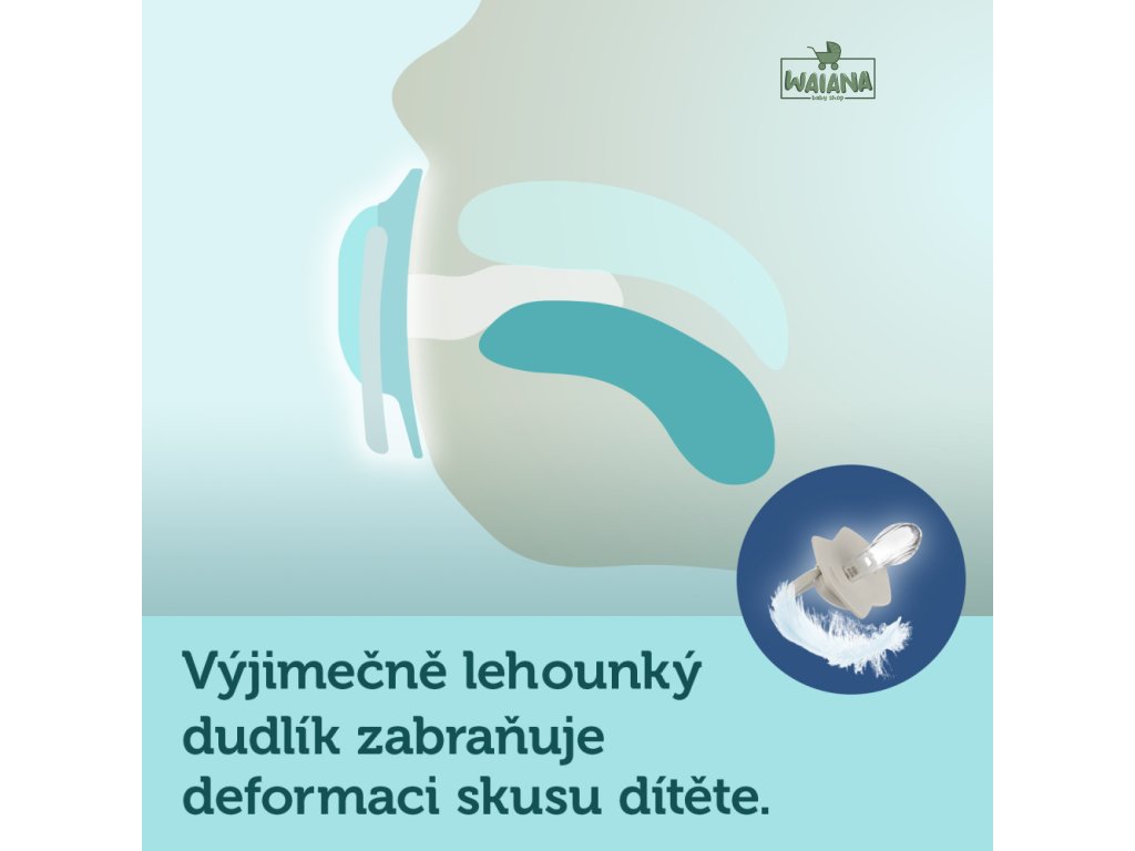 Gumička z mäkkého silikónu je úplne transparentná. Vyžaduje menšie úsilie pri saní, takže rýchlo upokojuje a zaisťuje pohodlie dieťatka.