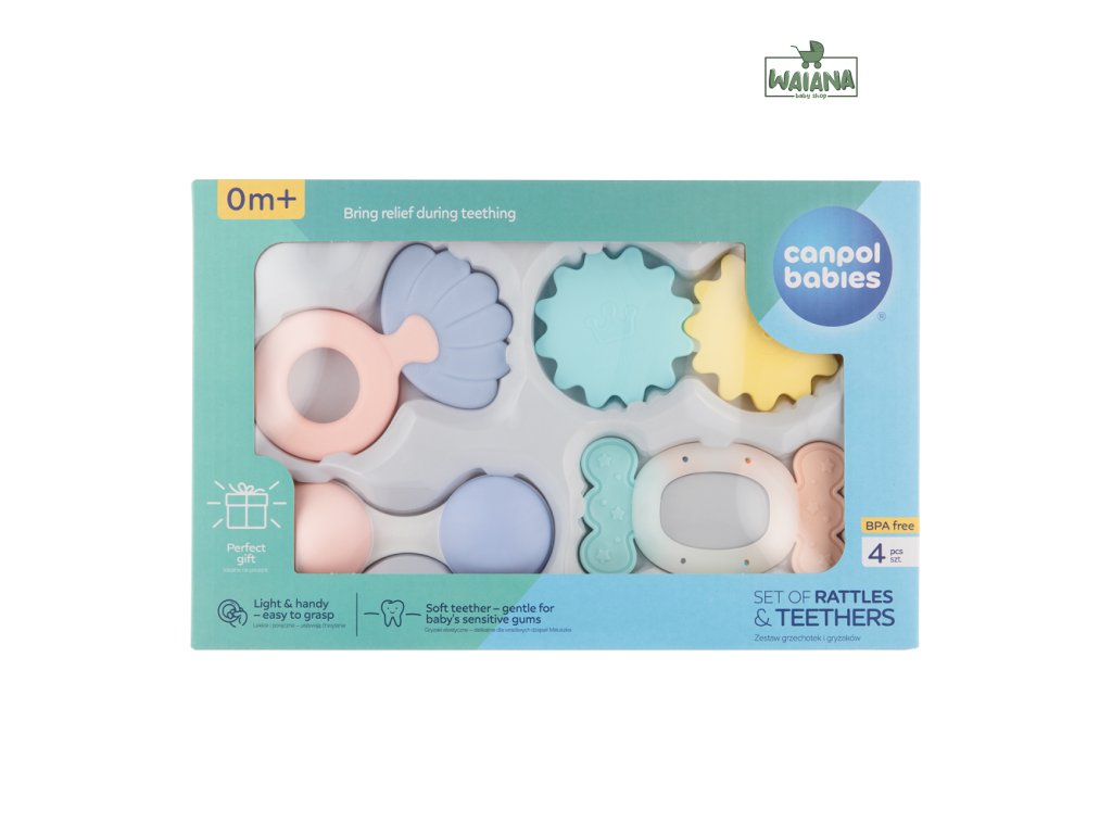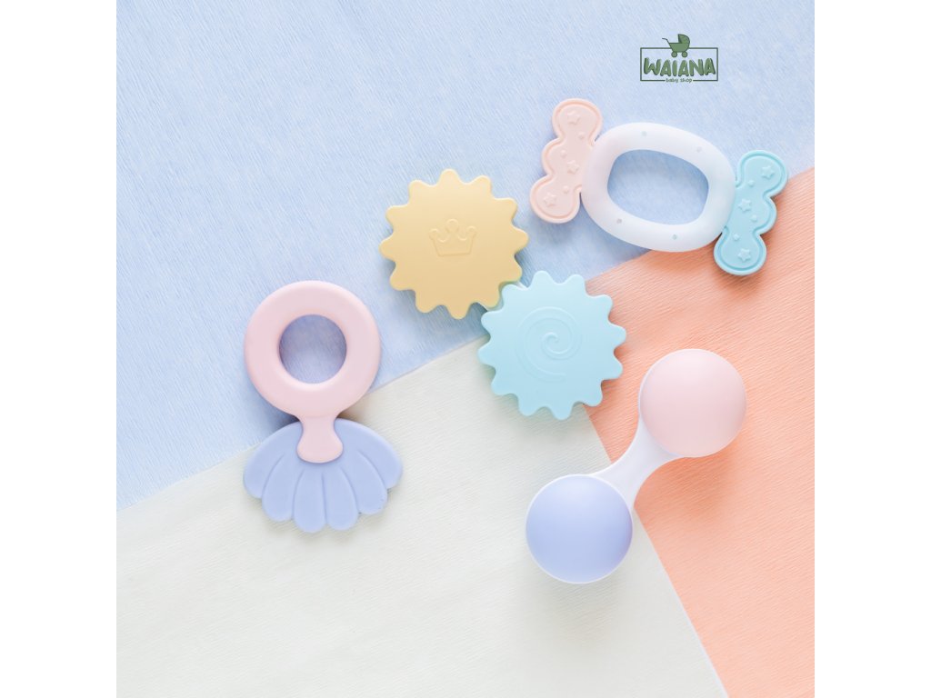 Roztomilý set hrkálok s hryzačkami v pastelových trendy farbách je praktickým darčekom pre tie najmenšie deti. Súčasťou je exkluzívna darčeková krabica. Nerovnomerný povrch pomáha masírovať svrbivé ďasná. Mäkký a pružný, hygienicky nezávadný materiál, zmierňuje bolesť ďasien bez podráždenia. Ľahký a praktický tvar bez ostrých hrán umožňuje deťom pohodlný úchop. Hrkajúce elementy stimulujú sluch dieťaťa.