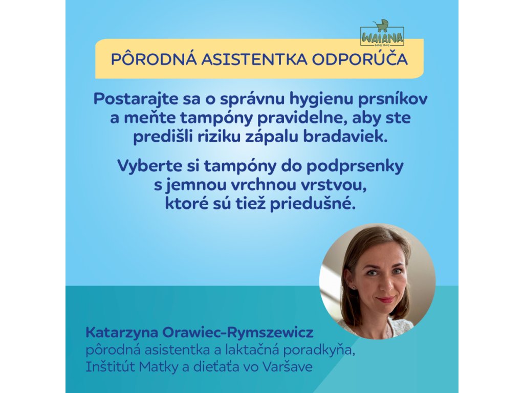 Priedušné jednorázové tampóny do podprsenky Canpol babies sú určené ženám v neskoršej fáze tehotenstva a dojčiacim matkám. Nedráždi citlivú pokožku prsníka ani bradavky. Mäkká absorpčná vrstva zadržuje vytekajúce mlieko a nepriepustná vonkajšia vrstva zabraňuje ušpineniu prádla. Samolepiaci pásik pomáha fixovať tampón na správnom mieste. Tampóny sa výborne prispôsobia tvaru prsníka a ich použitie je veľmi diskrétne. Dodávajú sa v balení po 30 kusoch.