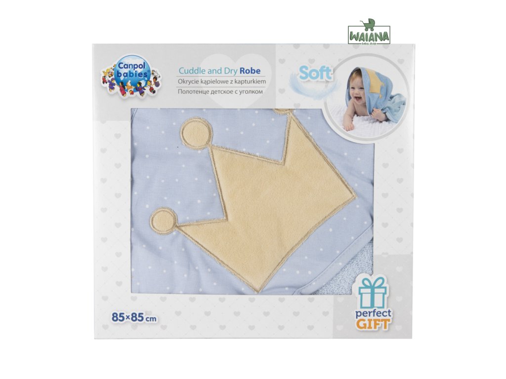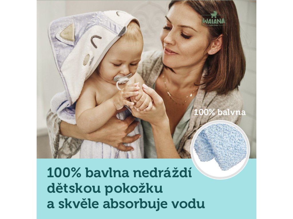 Praktický župan s kapucňou je nenahraditeľný počas večerného kúpeľa. Je zo 100 % bavlny, ktorá dokonale absorbuje zvyškovú vodu, čo umožňuje dlho udržiavať telesné teplo. Je mäkký a jemný, takže nedráždi pokožku. Voľný strih neobmedzuje pohyby dieťaťa. Našitá kapucňa chráni mokrú hlavu pred vychladnutím. Rozmery županu: 85 x 85 cm.
