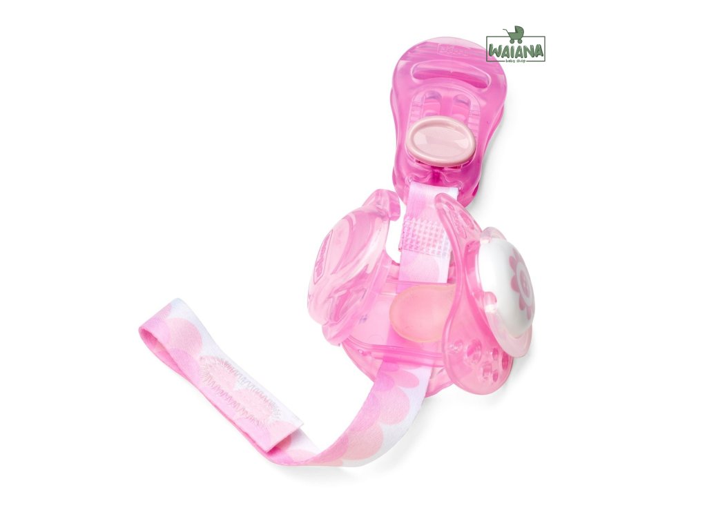 Hygiena:Súčasťou držiaka je praktické puzdro, ktoré slúži na hygienické uloženie cumlíka, keď ho dieťa nepoužíva.Puzdro chráni cumlík pred nečistotami.
