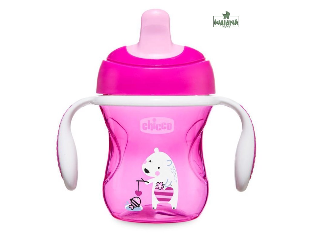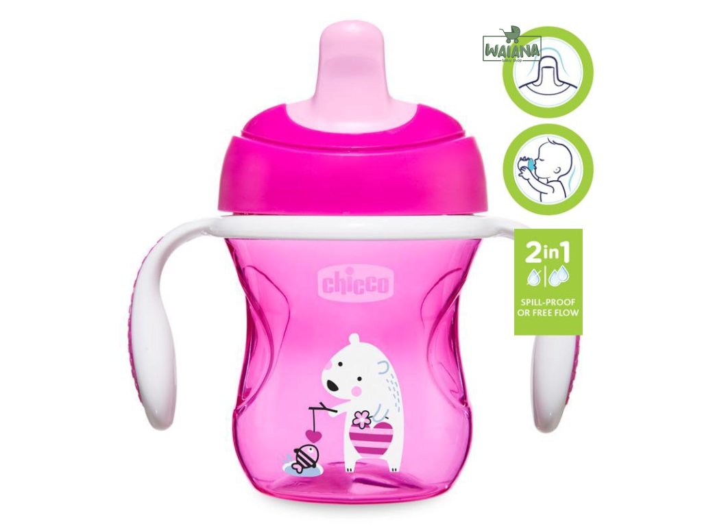 Hrnček Chicco Trénujeme je ideálny na prechod od fľaše k prvému hrnčeku a samostatnému pitiu.