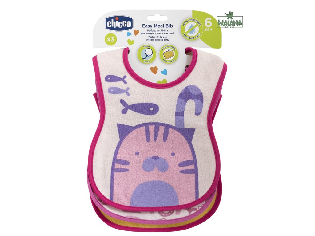 Podbradníky Chicco Easy Meal sú vyrobené z mäkkej bavlny a sú ideálne na zabránenie vzniku škvŕn na oblečení, keď začne dieťa s prvými pokusmi o stolovanie.