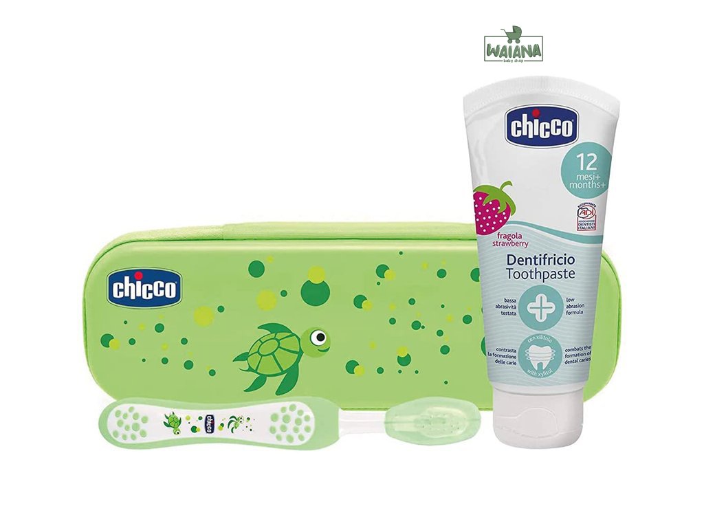 CHICCO Set zubná kefka a pasta s fluórom v puzdre Always Smiling zelená 12m+