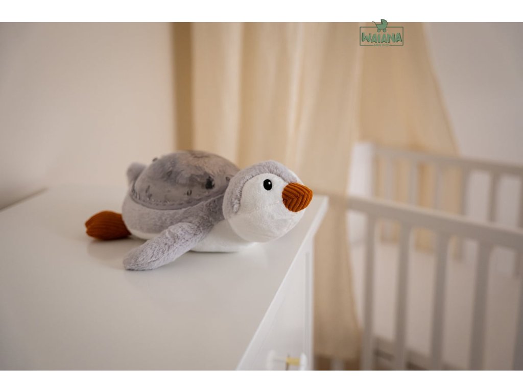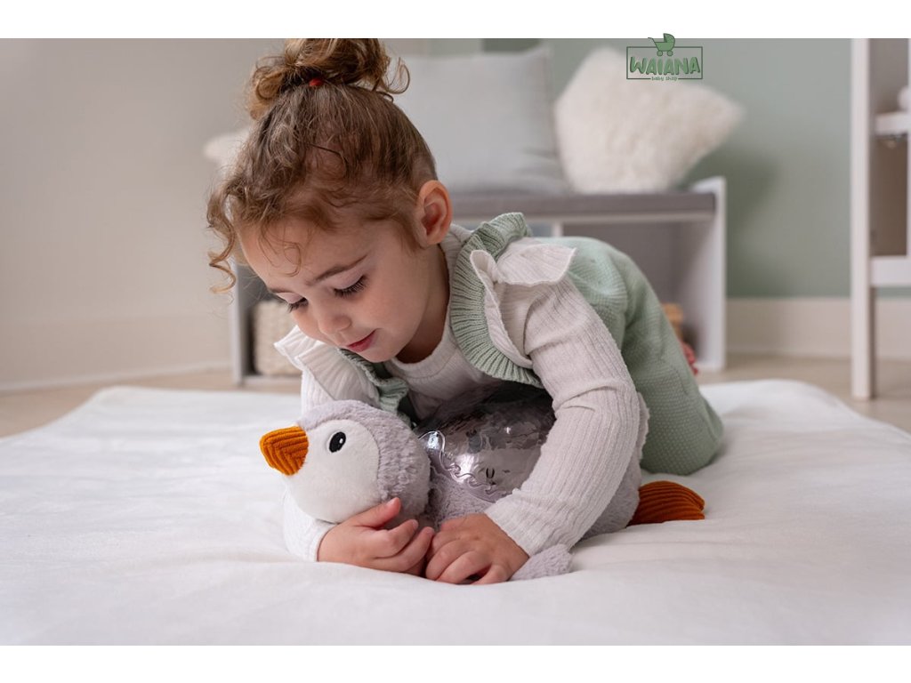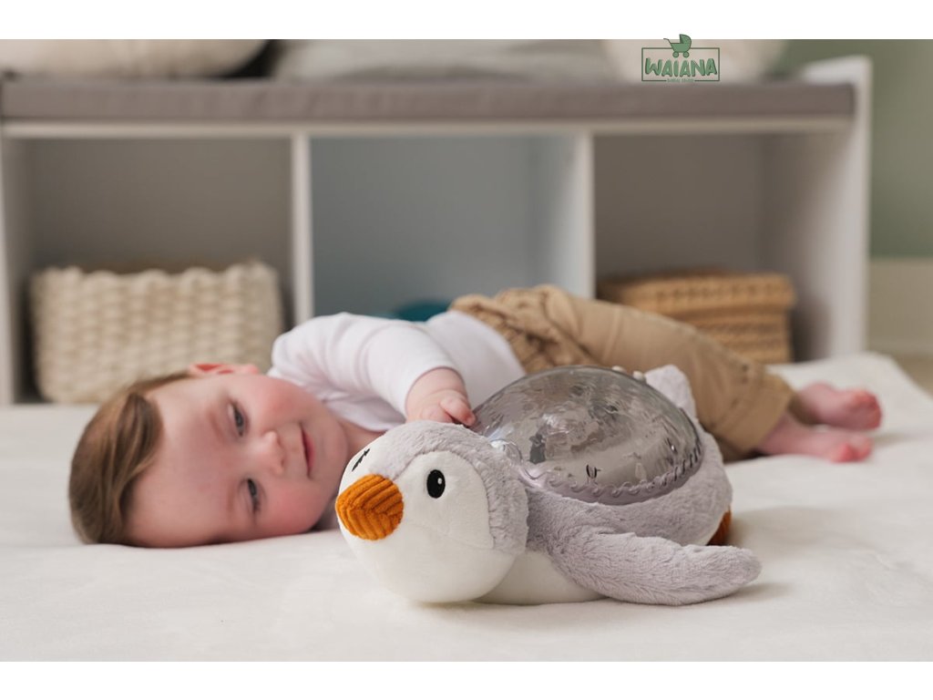 Cloud b® Tranquil Penguin™ je ideálnym spoločníkom pre bábätká aj staršie deti, ktoré potrebujú pocit bezpečia v tme. Tento rozkošný plyšový tučniak slúži ako nočné svetlo, ktoré premieta jemný pohyblivý efekt podvodného polárneho svetla na strop, a zároveň prehráva upokojujúce zvuky pre bezproblémové zaspávanie. Je to skvelý spôsob, ako vytvoriť relaxačnú atmosféru a podporiť deti v pokojnom spánku, a to nielen v noci, ale aj počas dňa, kedy sa tučniak mení na mäkkého plyšového spoločníka.