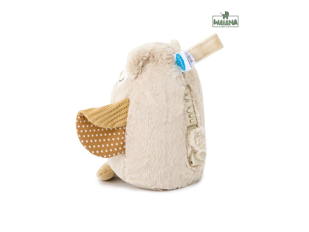 Spiaca sova- nádherné plyšové zvieratko s melódiou.Krásna sova príjemná na dotyk prinesie na myseľ nezabudnuteľné staré hračky. Vďaka moderným funkciám je však maznavejšia. Srdcový rytmus matky - pomáha v ranom vývoji dieťaťa. Hladká hračka spôsobí, že sa dieťa pri prebudení nebude cítiť osamelé v miestnosti - jeho priateľ je vždy vedľa neho. Ľahko ho môžete pripevniť na detskú postieľku alebo ohrádku.Spiaca sova rýchlo upokojí zmysly vášho dieťaťa a dá mu zdravý a pokojný spánok. Hrá 4 tiché melódie:- DREAM - srdcový rytmus matky- PEACE - jarný dážď- DREAM - morské vlny- RELAX - piesne veľrýbVšetky tieto zvuky prírody pomôžu vášmu dieťaťu relaxovať a pokojne odpočívať. Spiaca sova so zvukovým senzorom rýchlo upokojí zmysly vášho dieťaťa. Dá mu zdravý a pokojný spánok. Cloud B zaisťuje najvyššiu kvalitu výkonu. Sova má suchý zips, vďaka čomu ju môžete rýchlo pripevniť na detskú postieľku, ako aj ovládanie hlasitosti a časovač spánku. Zvukový senzor - dve možnosti - 23 alebo 45 minút . Keď sa dieťa prebudí a bude plakať, zvuky sa znova zapnú v čase, ktorý ste predtým nastavili, môžete zapnúť vysokú alebo nízku citlivosť zvuku. Hudobný box je odnímateľný a má vymeniteľné batérie.Príbeh pred spaním.„Je čas ísť do postele“, povedala mama.„Prosím ... môžem ešte zostať? Chcem sa hrať. “„Nie, je čas ísť spať,“ povedala.Idem si veľmi pomaly vyčistiť zuby. Obliekol som si pyžamo, to s nôžkami. Mám ho rád. Je pohodlné! Už ležím v útulnej posteli a usmievam sa. Mama sa nakloní a dá mi pusu na líce."Sladké sny!" hovorí a popravuje mi vankúš pod hlavou. „Je moja chobotnička pri posteli?“„Áno,“ hovorí mama.A hviezdy tancujú na strope, žiaria v diaľke, zatiaľ čo vlny oceánu šumia ... šumia ... a húpajú ma kým nezaspím.Rozmery:-veľkosť hračky asi 23 cm-rozmery balenia: šírka 19 cm, výška 24 cm, hĺbka 18 cm-hračka vyžaduje 2 AA 1,5 V batérie - pripojený testTechnické údaje.-vek: 0+ -rozmery balenia: D 19 cm x Š 18 cm x V 24 cm -béžová farba -materiál: plyš -rozmery (cm): cca 23 cm -hmotnosť produktu po vybalení: 0,643 kg -hmotnosť s balením: 0,643 kg