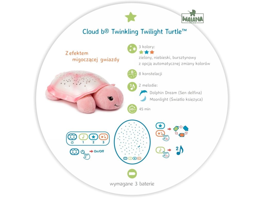 Cloud b® Twinkling Twilight Turtle™- Nočné svetielko s melódiou, Korytnačka, ružová, 0m+